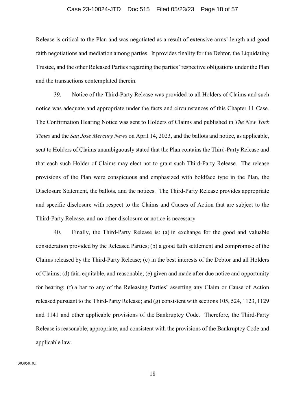 1830395810.1释放对《计划》至关重要,是各方经过广泛的公平和善意谈判和调解后谈判达成的。它为债务人、清算受托人和其他被解除担保方提供了关于各方各自在计划下的义务和计划中所设想的交易的最终性。39.向所有索赔人提供了第三方解除通知,根据第11章案件的事实和情况,这种通知是充分和适当的。确认听证通知已发送给索赔持有人,并于2023年4月14日在《纽约时报》和《圣何塞水星报》上发表。在适用的情况下,发送给索赔持有人的选票和通知明确指出,该计划包含第三方发布,并且每个此类索赔持有人可以选择不授予此类第三方发布。《计划》中的发布条款非常醒目,并在《计划》、披露声明、选票和通知中以黑体字加以强调。第三方发布就受第三方发布约束的索赔和诉讼理由提供了适当和具体的披露,无需其他披露或通知。40.最后,第三方免责声明是:(a)以被解除担保方提供的良好和有价值的对价作为交换;(b)对第三方免责声明解除的债权作出善意的解决和妥协;(c)为了债务人和所有债权持有人的最佳利益;(d)公平、公平和合理;(e)在适当通知和听证机会之后发出和作出;(f)禁止任何解除担保方主张根据第三方免责声明解除的任何债权或诉讼理由;(g)与第105、524、1123条一致,1129和1141以及《破产法》的其他适用条款。因此,第三方释放是合理、适当的,并且符合《破产法》和适用法律的规定。判例23-10024-JTD Doc 515提交05/23/23第18页,共57页