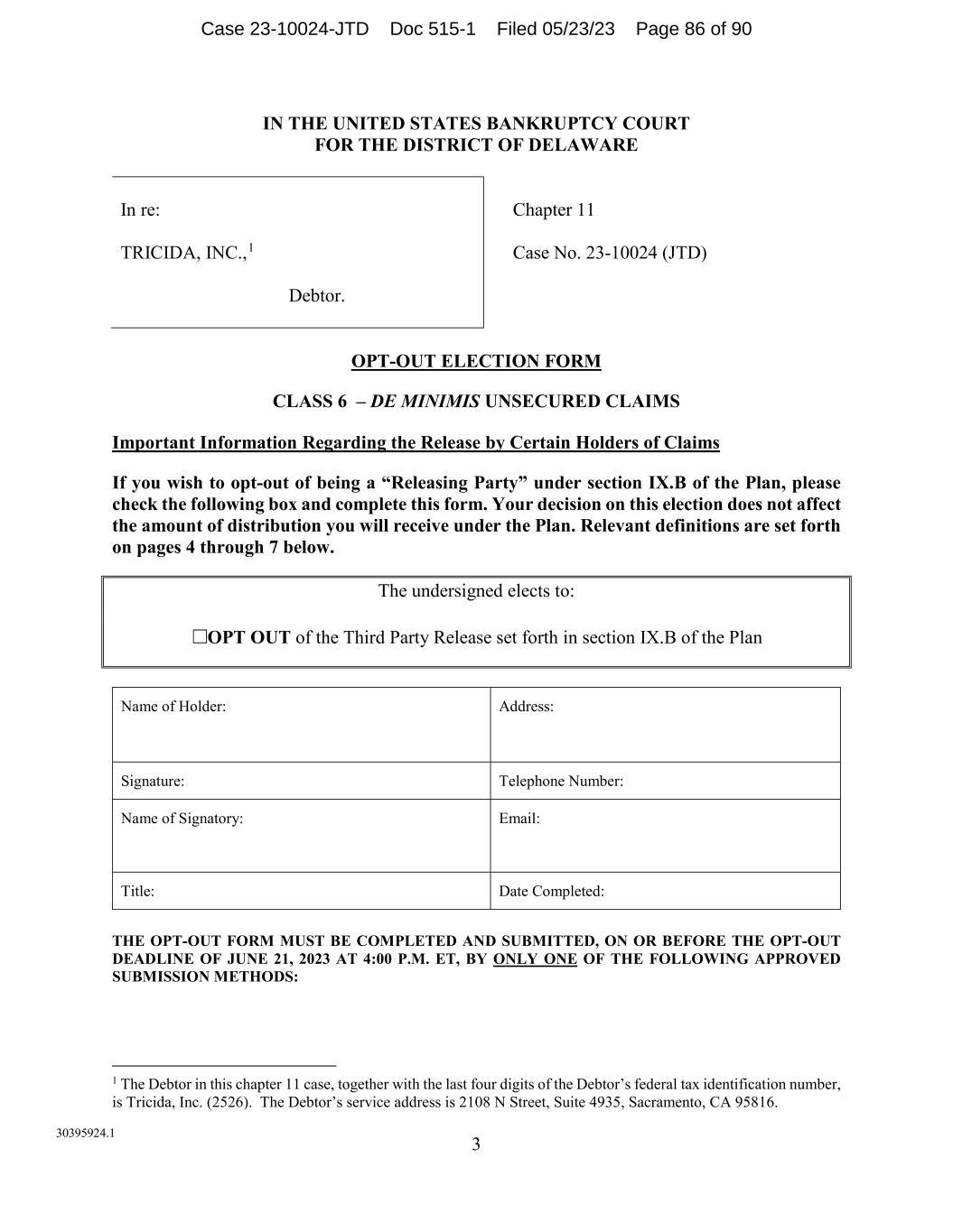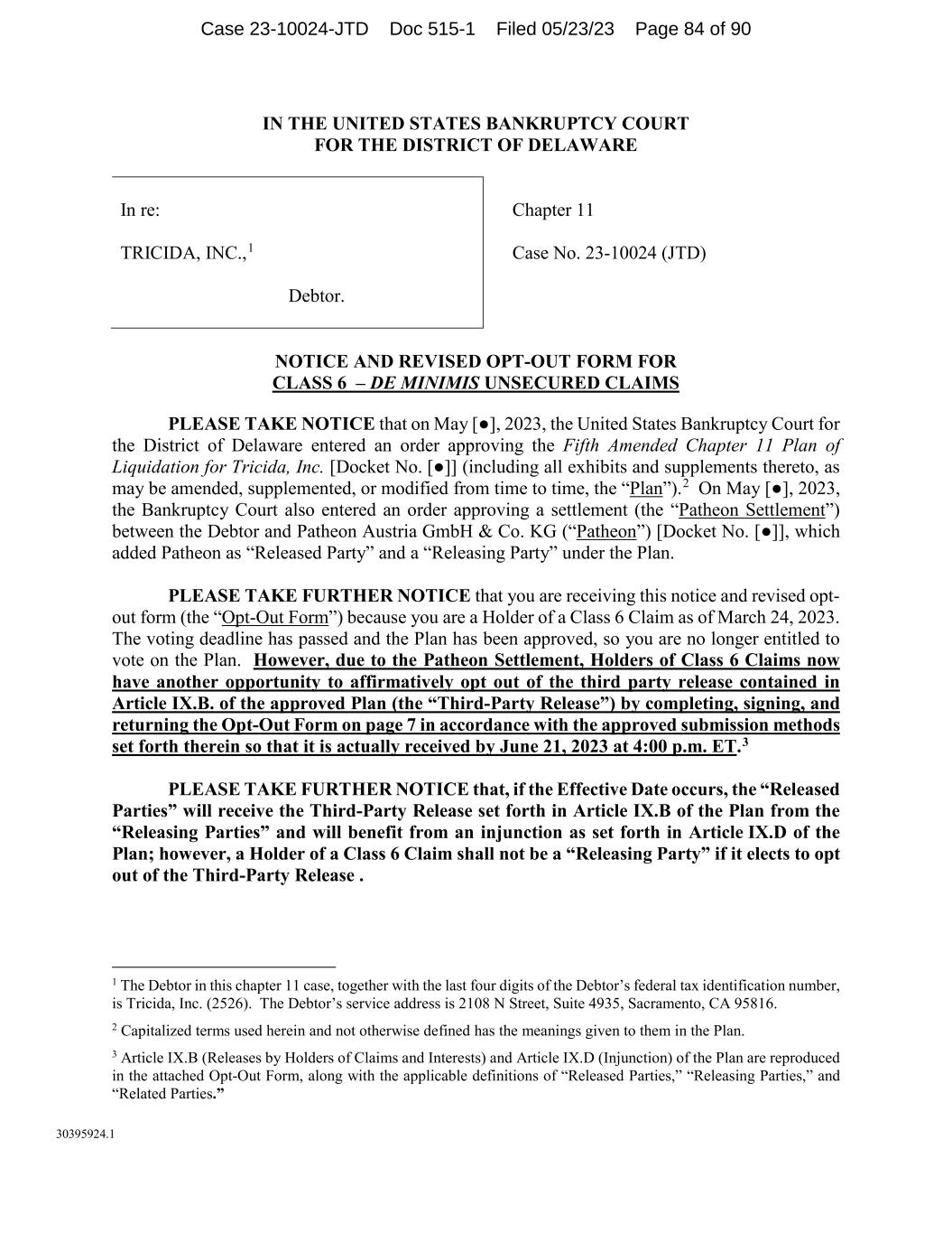 30395924.1 IN THE UNITED STATES BANKRUPTCY COURT FOR THE DISTRICT OF DELAWARE In re:TRICIDA,INC.,1 Debtor。第11章案件编号23-10024(JTD)NOTICE AND REVISED OPT-OUT FORM FOR CLASS6 – DE MINIMIS UNSECURED CLAIMS PLEASE TAKE NOTICE that May [ ● ],2023,the United States Bankruptcy Court for the District of Delaware invested an order,approving the Fifth Amended Chapter 11 Plan of Liquidation for Tricida, Inc. [ Docket No. ] [ Docket No. ][ ● ] ](包括可能不时修订、补充或修改的“计划”的所有证物及其补充)。22023年5月[ ● ],破产法院还下达命令,批准债务人与Patheon Austria GmbH & Co. KG(“Patheon”)之间的和解(“Patheon和解”)[案卷编号。[ ● ] ],根据该计划,Patheon被添加为“释放党”和“释放党”。请进一步注意,您收到此通知和修改后的选择退出表格(“选择退出表格”),因为截至2023年3月24日,您是第6类索赔的持有人。投票截止日期已过,该计划已获批准,因此你不再有权就该计划投票。然而,由于Patheon和解协议,第6类索赔的持有人现在有另一个机会明确地选择退出批准计划第IX.B条所载的第三方释放(“第三方释放”),方法是按照其中规定的批准提交方法填写、签署并返回第7页的选择退出表格,以便在美国东部时间2023年6月21日下午4:00之前实际收到。3请进一步注意,如果生效日期发生,“被解放方”将从“解放方”获得计划第IX.B条规定的第三方解放方,并将受益于计划第IX.D条规定的强制令;但是,如果第6类债权持有人选择退出第三方解放方,则不应成为“解放方”。1第11章案件中的债务人,连同债务人联邦税号的最后四位数字,是Tricida, Inc.(2526)。债务人的服务地址是2108 N Street,Suite 4935,Sacramento,加利福尼亚州 95816。2此处使用的、未另行定义的大写术语具有本计划赋予它们的含义。3本计划第IX.B条(债权和权益持有人的解除)和第IX.D条(禁止令)载于所附的选择退出表格,以及适用的“解除方”、“解除方”和“相关方”的定义。判例23-10024-JTD Doc 515-1提交05/23/23第84页,共90页