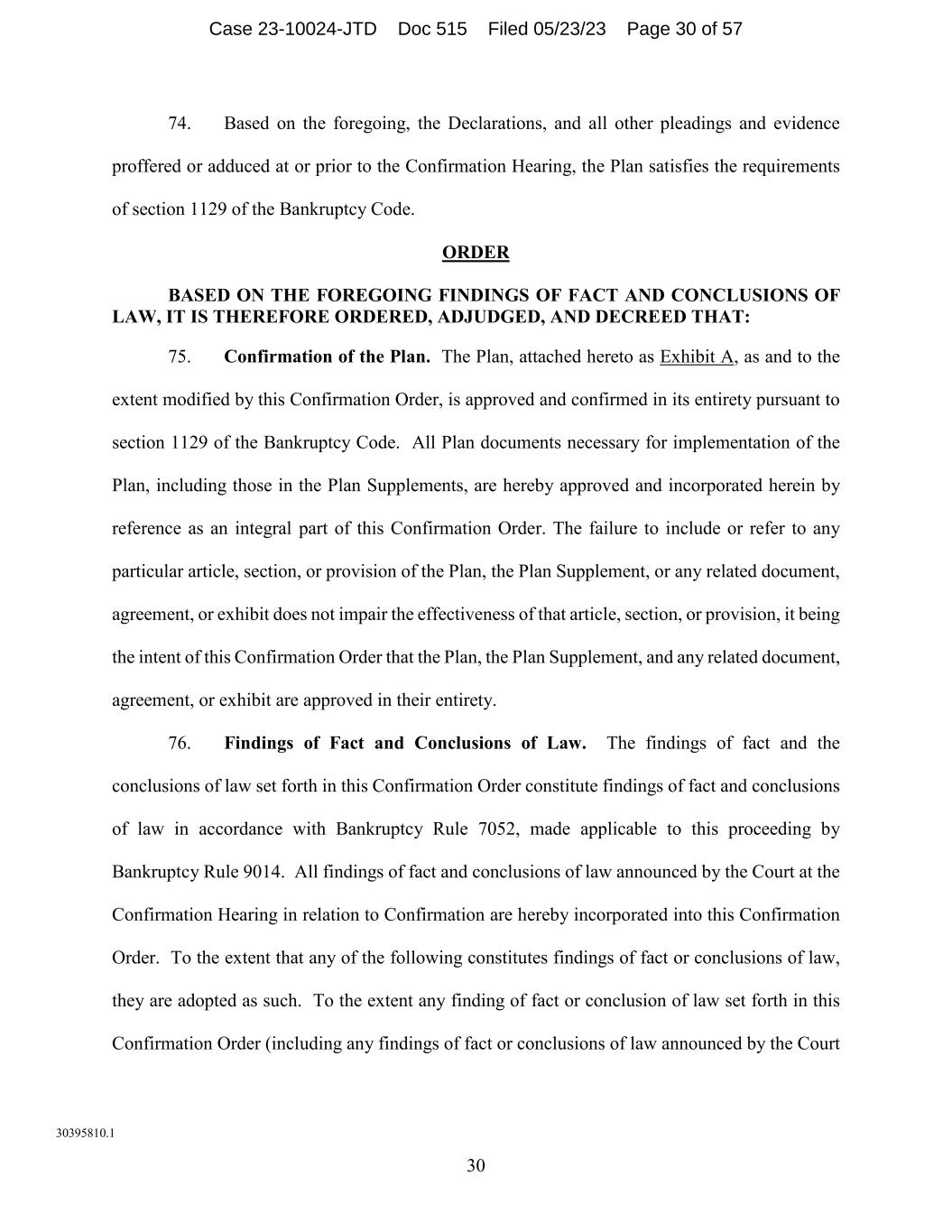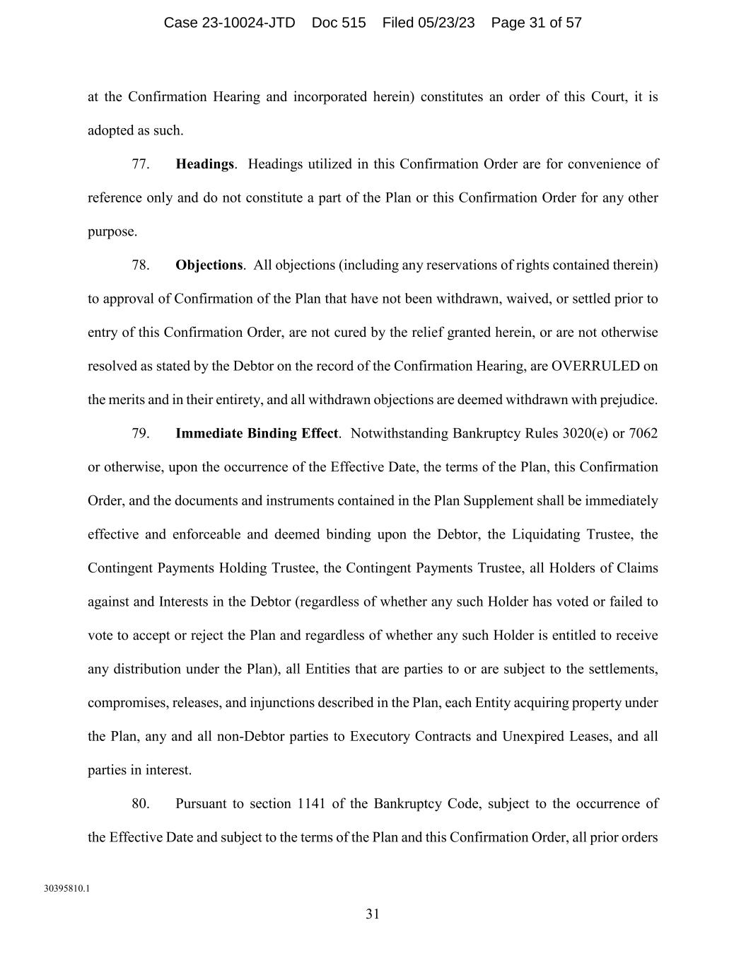 30 30395810.1 74.根据上述情况、声明以及在确认听证会上或之前提出或援引的所有其他书状和证据,本计划符合《破产法》第1129条的规定。根据上述事实和法律结论,命令、裁定和裁定:75。确认计划。根据《破产法》第1129条的规定,本计划作为附件 A,并在本确认令修改的范围内予以批准和确认。执行本计划所需的所有计划文件,包括计划补充文件中的文件,现予批准,并以引用方式纳入本确认令的组成部分。未列入或提及计划、计划补编或任何相关文件、协议或展品的任何特定条款、章节或规定,并不损害该条款、章节或规定的效力,本确认令的意图是,计划、计划补编和任何相关文件、协议或展品的全部获得批准。76.事实调查结果和法律结论。根据破产规则第7052条,本确认令所载的事实认定和法律结论构成事实认定和法律结论,破产规则第9014条规定适用于本程序。法院在确认聆讯中宣布的与确认有关的所有事实调查结果及法律结论,现纳入本确认令。凡下列任何一项构成事实认定或法律结论,则作为事实认定或法律结论予以采纳。本确认令所载的任何事实裁定或法律结论(包括法院判例23-10024-JTD Doc 515所宣布的任何事实裁定或法律结论提交05/23/23第30页,共57页)