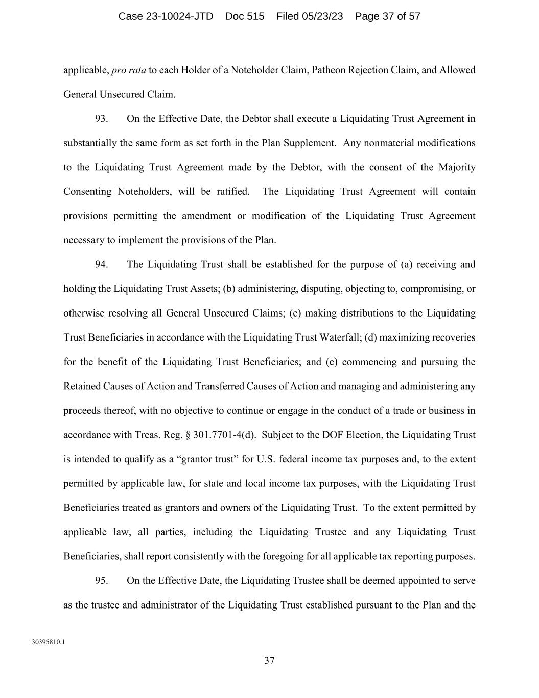37303958 10.1适用于记事人索赔、Patheon驳回索赔和允许的一般无担保索赔的每一持有人,按比例计算。93.自生效之日起,债务人应以与计划补充文件中规定的基本相同的形式签署清算信托协议。债务人对清算信托协议作出的任何非实质性修改,经多数同意票据持有人同意后,将予以批准。清算信托协议将包含允许修改或修改清算信托协议的条款,以执行计划的条款。94.清算信托的设立应为以下目的:(a)接收和持有清算信托资产;(b)管理、争议、反对、损害或以其他方式解决所有一般无担保债权;(c)按照清算信托瀑布向清算信托受益人进行分配;(d)为清算信托受益人的利益实现最大限度的追偿;以及(e)启动和执行保留诉讼因由和转移诉讼因由,并管理和管理其任何收益,目的不在于按照Treas. Reg. § 301.7701-4(d)继续或从事某项贸易或业务。根据自由度选举,清算信托在美国联邦所得税方面是作为“设保人信托”的,在适用法律允许的范围内,在州和地方所得税方面是作为“设保人信托”的,清算信托受益人被视为清算信托的设保人和所有者。在适用法律允许的范围内,所有各方,包括清算受托人和任何清算信托受益人,应为所有适用的报税目的,按照上述规定进行报告。95.在生效日期,清算受托人应被视为被指定为根据计划和案例23-10024-JTD Doc 515设立的清算信托的受托人和管理人提交05/23/23第37页,共57页