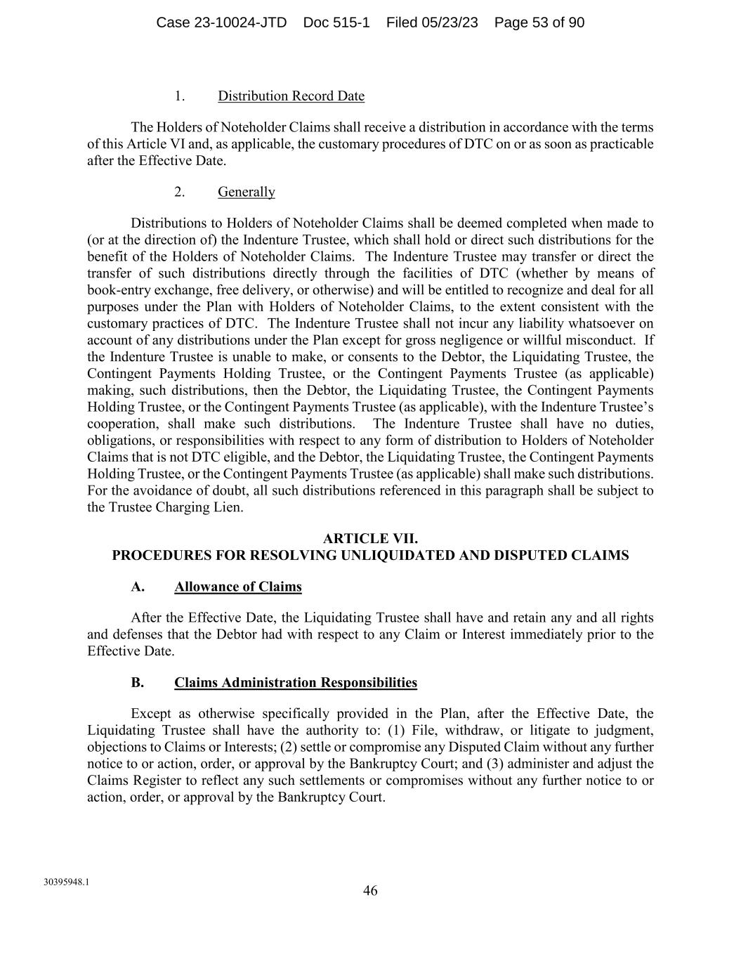 46 30395948.1 1.分配记录日期票据持有人债权持有人应在生效日期当日或之后的实际可行时间内,按照第六条的规定和DTC的惯例程序(如适用的话)获得分配。2.一般而言,向记名债权人债权持有人作出的分配,在向(或在其指示下)义齿受托人作出时,应视为已完成,而该受托人应为记名债权人债权持有人的利益而持有或指挥此种分配。契约受托人可通过DTC的设施直接转让或指示转让这种分配(无论是通过记账式交换、免费交付或其他方式),并将有权在符合DTC惯例的范围内,为《计划》的所有目的与票据持有人债权进行确认和交易。契约受托人不得因计划下的任何分配而承担任何法律责任,但重大疏忽或故意失当行为除外。如果义齿受托人不能进行或同意债务人、清算受托人、或有付款持有受托人或或有付款受托人(如适用)进行此类分配,则债务人、清算受托人、或有付款持有受托人或有付款受托人(如适用)应在义齿受托人的合作下进行此类分配。对于不符合DTC资格的票据持有人债权的任何形式的分配,契约受托人不承担任何义务、义务或责任,债务人、清算受托人、或有付款受托人或或有付款受托人(如适用)应进行此类分配。为免生疑问,本段所提述的所有该等分配均须受受托人押记留置权规限。第七条。解决未清偿和有争议债权的程序A.在生效日期之后的债权备抵,清算受托人应拥有并保留债务人在紧接生效日期之前就任何债权或利息所拥有的任何和所有权利和抗辩。除本计划另有具体规定外,在生效日期后,清算受托人有权:(1)对债权或权益提出异议、撤回异议或就判决提起诉讼;(2)解决或妥协任何有争议的债权,而无需向破产法院发出任何进一步通知或采取行动、命令或批准;(3)管理和调整债权登记册,以反映任何此类和解或妥协,而无需向破产法院发出任何进一步通知或采取行动、命令或批准。判例23-10024-JTD Doc 515-1提交05/23/23第53页,共90页