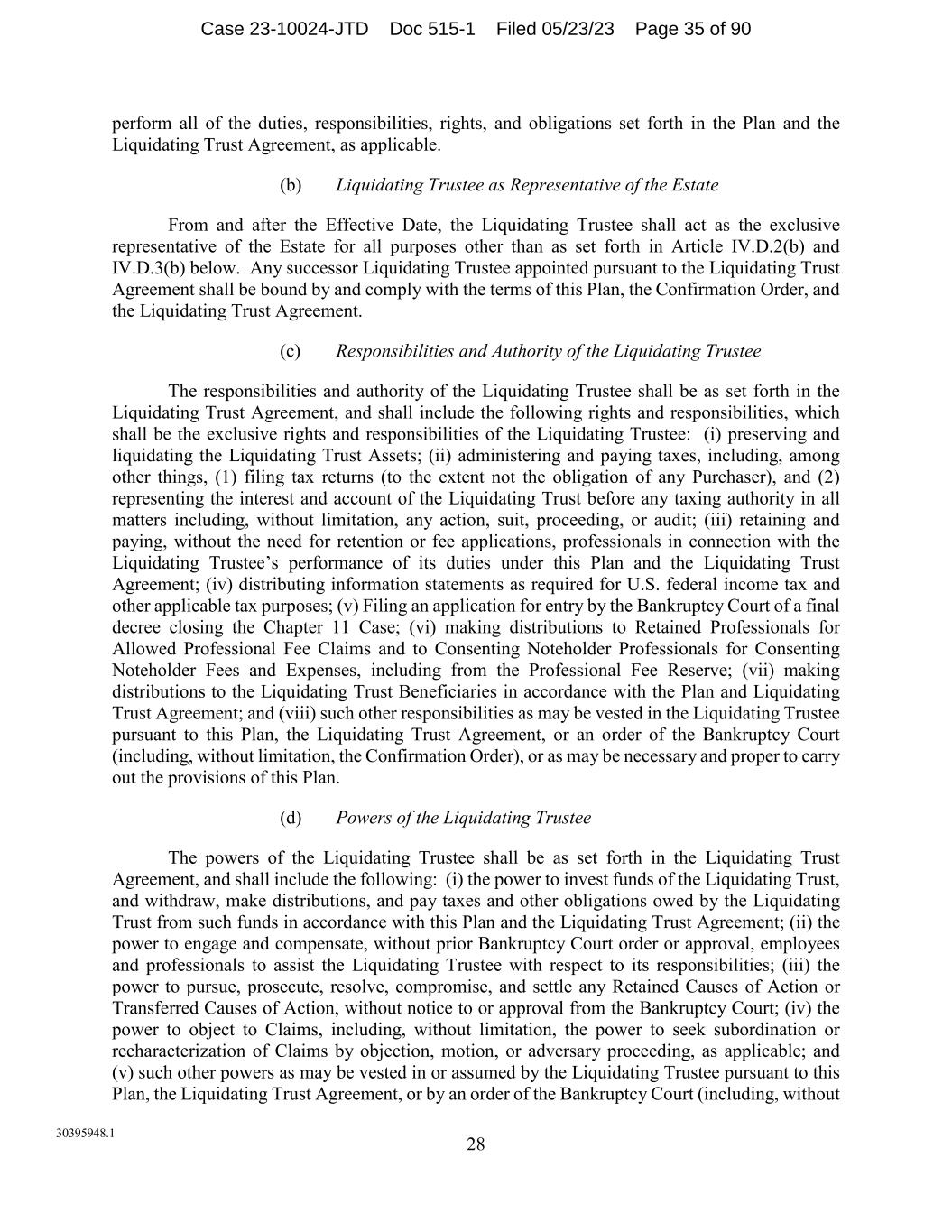 2830395948.1履行计划和清算信托协议中规定的所有职责、责任、权利和义务(如适用)。(b)清盘受托人作为遗产的代表自生效日期起及之后,除下文第IV.D.2(b)条和第IV.D.3(b)条所列的目的外,清盘受托人应作为遗产的专属代表。根据清算信托协议指定的任何继任清算受托人应受本计划、确认令和清算信托协议的条款约束并遵守这些条款。(c)清盘受托人的责任及权限清盘受托人的责任及权限须按《清盘信托协议》的规定,并须包括下列权利及责任,这些权利及责任均属清盘受托人的专属权利及责任:(一)保存及清盘清盘信托资产;(二)管理及缴付税款,其中包括(1)提交报税表(在不属任何买方的义务范围内);及(2)在所有事宜上代表清盘信托的权益及帐目,包括但不限于,任何诉讼、诉讼、程序或审计;(iii)保留和支付与清算受托人履行其在本计划和清算信托协议下的职责有关的专业人员,而无需保留或费用申请;(iv)分发美国联邦所得税和其他适用税务目的所需的信息报表;(v)提交申请,要求破产法院记录终结第11章案件的最终法令;(vi)向保留的专业人员发放允许的专业费用索赔和向同意的票据持有人专业人员发放同意的票据持有人费用和开支,(vii)根据计划及清盘信托协议向清盘信托受益人作出分配;及(viii)根据本计划、清盘信托协议或破产法院的命令(包括但不限于确认令)或为执行本计划的条文而可能有需要及适当的其他责任而可能归属清盘受托人。(d)清盘受托人的权力清盘受托人的权力须按《清盘信托协议》的规定,并须包括以下权力:(i)根据本计划及《清盘信托协议》,投资清盘信托的资金,以及提取、分配、缴付清盘信托所欠的税款及其他义务的权力;(ii)有权聘用雇员及专业人士,以协助清盘受托人履行其职责,而无须事先获破产法院命令或批准;(iii)有权追讨、检控,解决、妥协和解决任何保留的诉讼因由或转移的诉讼因由,而无需通知破产法院或获得破产法院的批准;(iv)对债权提出异议的权力,包括但不限于通过适用的反对、动议或对抗程序寻求债权从属地位或重新定性的权力;(v)清算受托人根据本计划、清算信托协议或通过破产法院的命令(包括,不包括案件23-10024-JTD Doc 515-1提交05/23/23第35页,共90页)可能授予或承担的其他权力