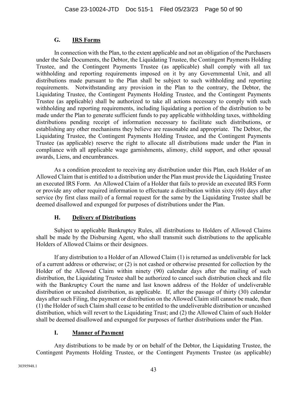 4330395948.1 G. IRS表格就本计划而言,在适用范围内,而不是买方根据销售文件承担的义务,债务人、清算受托人、或有付款持有受托人和或有付款受托人(如适用)应遵守任何政府单位对其规定的所有预扣税款和报告要求,根据本计划进行的所有分配均应遵守此类预扣税款和报告要求。尽管本计划中有任何相反的规定,但应授权债务人、清算受托人、或有付款受托人和或有付款受托人(如适用)采取一切必要行动,以遵守此类代扣代缴和报告要求,包括清算根据本计划进行的分配的一部分,以产生足够的资金来支付适用的代扣代缴税款,在收到促进此类分配所需的信息之前代扣代缴分配,或建立他们认为合理和适当的任何其他机制。债务人、清算受托人、或有付款持有受托人和或有付款受托人(如适用)保留按照所有适用的工资扣押、赡养费、子女抚养费和其他配偶奖励、留置权和产权负担分配计划下的所有分配的权利。作为根据本计划获得任何分配的先决条件,每名有权根据本计划获得分配的获准申索的持有人必须向清盘受托人提供一份已签立的内部资料表格。持有人的准许申索,如未能在清盘受托人发出正式的IRS表格要求(以第一类邮件)后六十(60)天内,提供已签立的IRS表格或任何其他所需资料以完成分配,则须当作不获准许,并为计划下的分配而删除。H.在符合适用的破产规则的情况下,分配给允许债权持有人的所有分配应由付款代理人进行,付款代理人应将此种分配转交给适用的允许债权持有人或其指定人。如任何分配予准许债权(1)的持有人的款项因没有当前地址或其他原因而被退回为无法交付;或(2)在该分配款项寄出后九十(90)个历日内未获兑现或以其他方式由准许债权的持有人呈交以供收取,则清算受托人须获授权取消该分配款项支票,并向破产法院提交适用的不可交付分配或未兑现分配款项的持有人的姓名及最后为人所知的地址。如果在提交申请后三十(30)个日历日之后,准许债权的付款或分配仍然不能进行,则(1)该债权的持有人不再有权获得无法交付的分配或未兑现的分配,这些分配将归还清算信托;以及(2)该持有人的准许债权应被视为不允许,并为根据本计划进行进一步分配而被删除。一、付款方式由债务人、清算受托人、或有付款持有受托人或或有付款受托人(如适用)或其代表进行的任何分配案例23-10024-JTD Doc 515-1提交05/23/23第50页,共90页