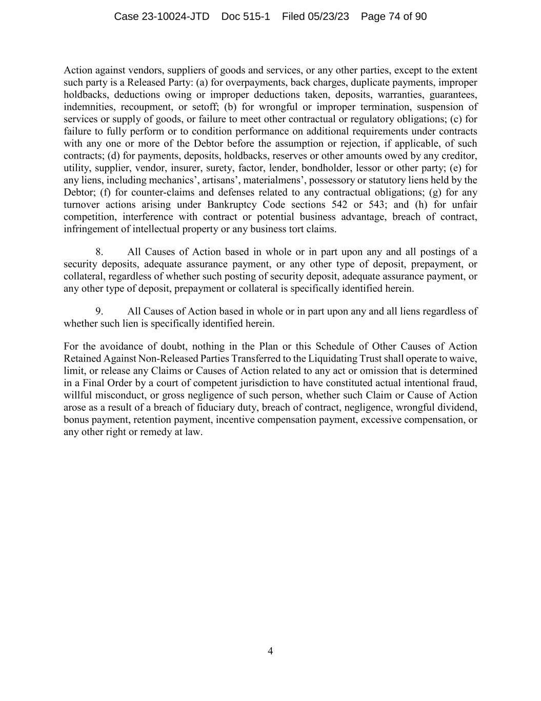 4针对供应商、货物和服务供应商或任何其他方提起的诉讼,除非这些方是被解约方:(a)多付款项、补缴费用、重复付款、不当拖延、欠款扣减或不当扣减、押金、保证、担保、赔偿、补偿或抵销;(b)不当或不当终止、暂停服务或供应货物,或未能履行其他合同或监管义务;(c)在承担或拒绝(如适用)之前,未能充分履行或以履行与任何一方或多方债务人签订的合同的额外要求为条件,(d)任何债权人、公用事业公司、供应商、卖方、保险人、保证人、保理人、保理人、出借人、债券持有人、出租人或其他当事人所欠的付款、押金、保留金或其他款项;(e)债务人持有的任何留置权,包括机械师、工匠、材料商、占有权或法定留置权;(f)与任何合同义务有关的反诉和抗辩;(g)根据《破产法》第542或543条引起的任何周转诉讼;(h)不公平竞争、干扰合同或潜在商业利益、违反合同、侵犯知识产权或任何商业侵权索赔。8.所有诉讼因由全部或部分基于保证金、充分保证付款或任何其他类型的保证金、预付款或抵押品的任何和所有过帐,无论此种过帐保证金、充分保证付款或任何其他类型的保证金、预付款或抵押品是否在本文中具体指明。9.所有诉讼因由全部或部分基于任何和所有留置权,而不论此种留置权是否在本文中具体指明。为免生疑问,本计划或本《其他诉讼因由附表》中的任何条文,不得用以免除、限制或解除与任何作为或不作为有关的任何索偿要求或诉讼因由,而该等作为或不作为是由主管司法管辖权的法院在最终命令中裁定构成该人的实际故意欺诈、故意不当行为或重大过失的,不论该等索偿要求或诉讼因由是由于违反信义责任、违反合约、疏忽、不当派息、奖金支付所致,保留金、奖励金、超额补偿金或其他任何法律上的权利或补救办法。判例23-10024-JTD Doc 515-1提交05/23/23第74页,共90页