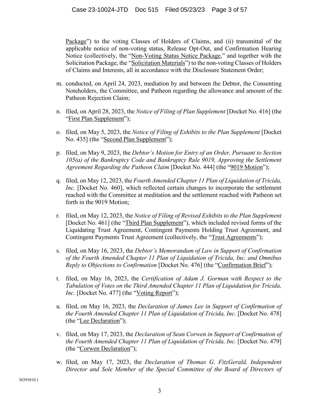 330395810.1包“)给有表决权的债权持有人类别,以及(ii)发送适用的无表决权状态通知、解除选择退出通知和确认听证通知(统称为”无表决权状态通知包",并连同招标包,即“招标材料”)向无投票权类别的债权和权益持有人提交,所有这些都是根据披露声明令进行的;m.于2023年4月24日由债务人、同意票据持有人、委员会和Patheon就Patheon拒绝债权的备抵和金额进行调解;n.于2023年4月28日提交了计划补充文件[第416号案卷](“第一份计划补充文件”);o.于2023年5月5日提交,根据《破产法》第105(a)条和《破产规则》第9019条,提交了提交计划补充文件[案卷编号435 ](“第二份计划补充文件”)的证物备案通知;p.于2023年5月9日提交了债务人请求根据《破产法》第105(a)条和《破产法》第9019条批准关于Patheon索赔的和解协议的申请[案卷编号444 ](“9019动议”);q.于2023年5月12日提交了第四份经修订的Tricida, Inc.第11章清算计划[案卷编号460 ],它反映了某些变化,以纳入在冥想时与委员会达成的和解协议,以及在2023年5月12日提交的9019动议中与Patheon达成的和解协议,即提交计划补充文件[第461号案卷](“第三计划补充文件”)的修订证明文件的通知,其中包括清算信托协议、或有付款持有信托协议和或有付款信托协议(统称“信托协议”)的修订表格;2023年5月16日提交的支持确认Tricida第四次修订的第11章清算计划的债务人法律备忘录,Inc. and Omnibus Reply to Objections to Confirmation [ Docket No. 476 ](“Confirmation Brief”);t. filed,on May 16,2023,the Certification of Adam J. Gorman with the Totes for the Third Amended Chapter 11 Plan of Liquidation for Tricida, Inc. [ Docket No. 477 ](“Voting Report”);u. filed,2023,the Declaration of James Lee in Support Confirmation of the Fourth Amended Chapter 11 Plan of Liquidation of Tricida, Inc. [ Docket No. 478 ](“Lee Declaration”);v. filed,2023,Sean Corwen支持确认Tricida, Inc.第四次修订的第11章清算计划的声明[案卷第479号](“Corwen声明”);w.2023年5月17日提交了Thomas G. FitzGerald的声明,Case 23-10024-JTD Doc 515的独立董事和董事会特别委员会的唯一成员提交05/23/23第3页,共57页