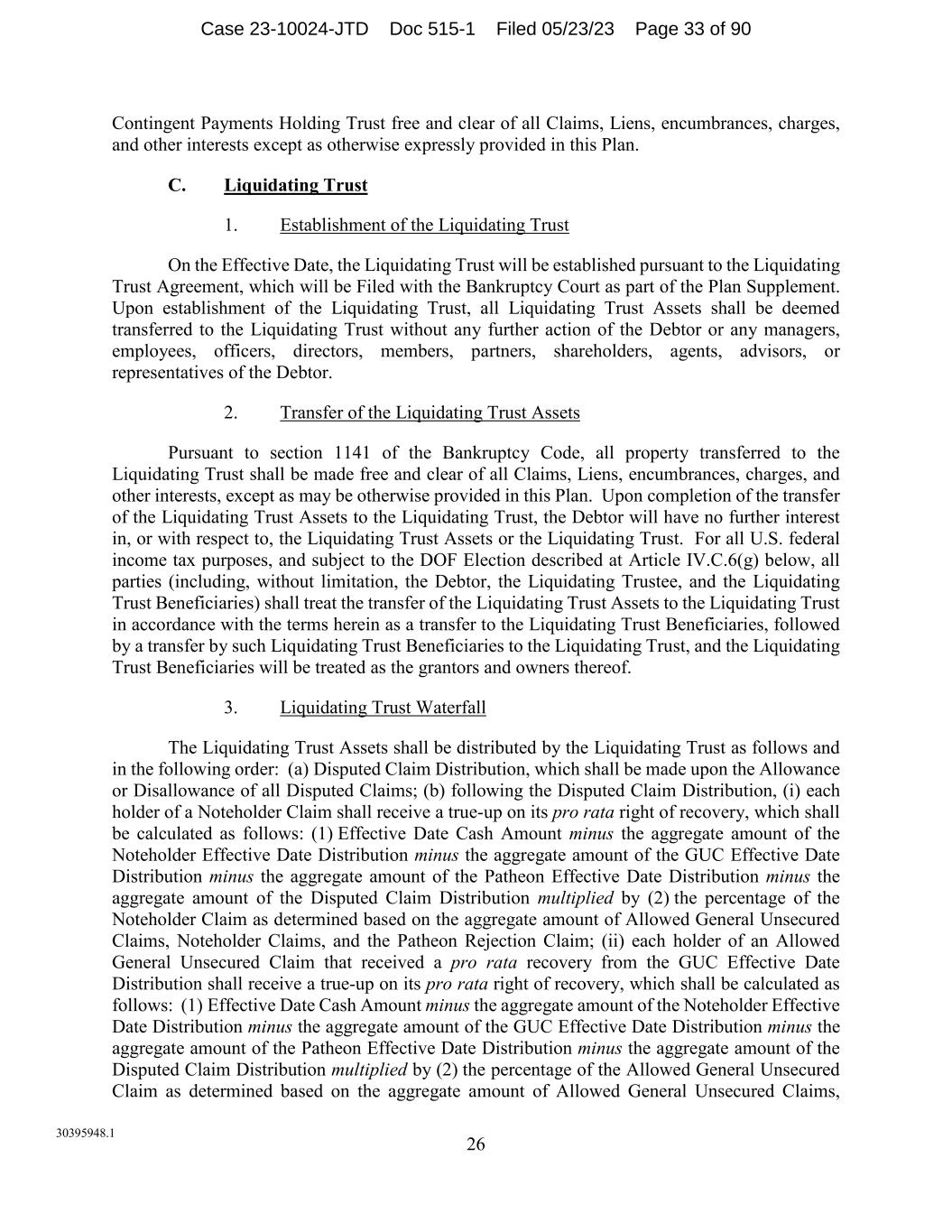 2630395948.1持有信托的或有付款,除本计划另有明文规定外,不附带任何债权、留置权、产权负担、费用和其他权益。清算信托1。清算信托的成立于生效日期,清算信托将根据清算信托协议成立,该协议将作为计划补充文件的一部分提交破产法院。清算信托成立后,所有清算信托资产应视为转移至清算信托,无须债务人或债务人的任何经理、雇员、高级职员、董事、成员、合伙人、股东、代理人、顾问或代表采取任何进一步行动。2.清算信托资产的转移根据《破产法》第1141条,所有转移到清算信托的财产应免于所有债权、留置权、产权负担、押记和其他权益,除非本计划另有规定。在清算信托资产向清算信托的转移完成后,债务人将不再拥有清算信托资产或清算信托的权益,也不再拥有清算信托资产或清算信托的权益。就所有美国联邦所得税而言,并受下文第IV.C.6(g)条所述的自由度选举的约束,所有各方(包括但不限于债务人、清算受托人和清算信托受益人)应将清算信托资产按照本条款转移至清算信托视为转移至清算信托受益人,随后清算信托受益人将转移至清算信托,清算信托受益人将被视为设保人和所有者。3.清算信托瀑布清算信托资产应由清算信托按以下顺序分配:(a)争议债权分配,应在所有争议债权被允许或被拒绝后进行;(b)在争议债权分配之后,(i)票据持有人债权的每一持有人应收到对其按比例追偿权的校正,计算方法如下:(1)生效日期现金金额减去票据持有人生效日期分配总额减去GUC生效日期分配总额减去Patheon生效日期分配总额减去争议债权分配总额乘以(2)根据允许的一般无担保债权、票据持有人债权的总额确定的票据持有人债权的百分比,和Patheon驳回债权;(ii)从GUC生效日期分配中获得按比例追偿的获准一般无担保债权的每一持有人,应获得对其按比例追偿权利的更正,计算方法如下:(1)生效日期现金金额减去票据持有人生效日期分配总额减去GUC生效日期分配总额减去Patheon生效日期分配总额减去争议债权分配总额乘以(2)允许的一般无担保债权的百分比,该百分比是根据允许的一般无担保债权的总额确定的,案例23-10024-JTD Doc 515-1提交05/23/23第33页,共90页