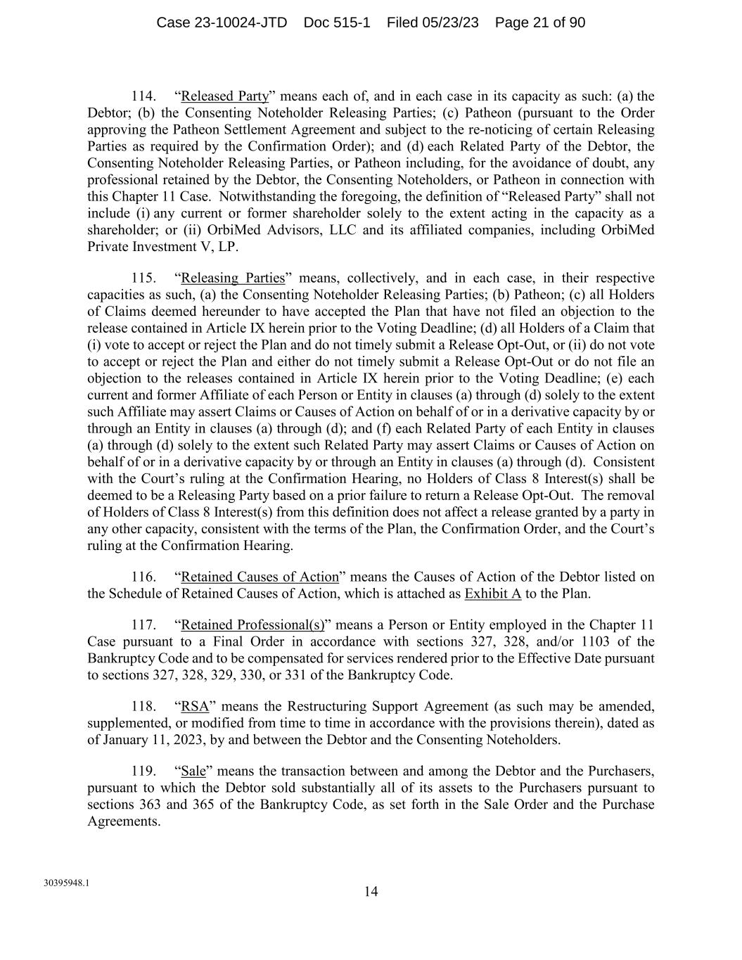 14 30395948.1 114.“解除担保方”是指每一方,并在每一种情况下以其身份:(a)债务人;(b)同意的票据持有人解除担保方;(c)Patheon(根据批准Patheon和解协议的命令,并须根据确认令的要求,由某些解除担保方重新通知);(d)债务人的每一关联方、同意的票据持有人解除担保方或Patheon,包括为免生疑问而由债务人、同意的票据持有人或Patheon聘用的与第11章案件有关的任何专业人员。尽管有上述规定,“被解放方”的定义不应包括(i)仅以股东身份行事的任何现任或前任股东;或(ii)OrbiMed Advisors,LLC及其附属公司,包括OrbiMed Private Investment V,LP。115.“解除担保方”是指(a)同意的票据持有人解除担保方;(b)Patheon;(c)在表决截止日期之前未对本协议第九条所载的解除担保权提出异议的根据本协议被视为已接受本计划的所有债权持有人;(d)(i)投票接受或否决本计划且未及时提交解除选择权的所有债权持有人,(ii)不投票接受或否决该计划,或不及时提交解除选择退出,或不在投票截止日期前对本文第九条所载的解除提出反对;(e)(a)至(d)条中每个人或实体的每个现任和前任附属机构,仅限于该附属机构可以代表或通过(a)至(d)条中的一个实体以衍生身份或通过该实体主张索赔或诉讼理由;(f)(a)至(d)条中的每一实体的每一关联方,仅限于该关联方可以代表或通过(a)至(d)条中的某一实体以衍生身份提出索赔或诉讼理由。根据法院在确认聆讯中的裁决,第8类权益的任何持有人均不得因先前未能退回选择退出的解除协议而被视为解除协议的一方。将第8类权益持有人从这一定义中除名并不影响一方以任何其他身份根据计划、确认令和法院在确认聆讯中的裁决所给予的释放。116.“保留诉讼因由”是指《保留诉讼因由附表》所列债务人的诉讼因由,该附表作为附件 A附于本计划。117.“保留专业人员”是指根据《破产法》第327、328和/或1103条根据最终命令在第11章案件中受雇的个人或实体,并根据《破产法》第327、328、329、330或331条在生效日期之前提供的服务获得补偿。118.“RSA”是指债务人与同意票据持有人于2023年1月11日签署的《重组支持协议》(该协议可根据协议中的规定不时修订、补充或修改)。119.“出售”是指债务人与买方之间的交易,据此,债务人根据《破产法》第363和365条将其几乎全部资产出售给买方,正如《销售命令》和《购买协议》所规定的那样。判例23-10024-JTD Doc 515-1提交05/23/23第21页,共90页
