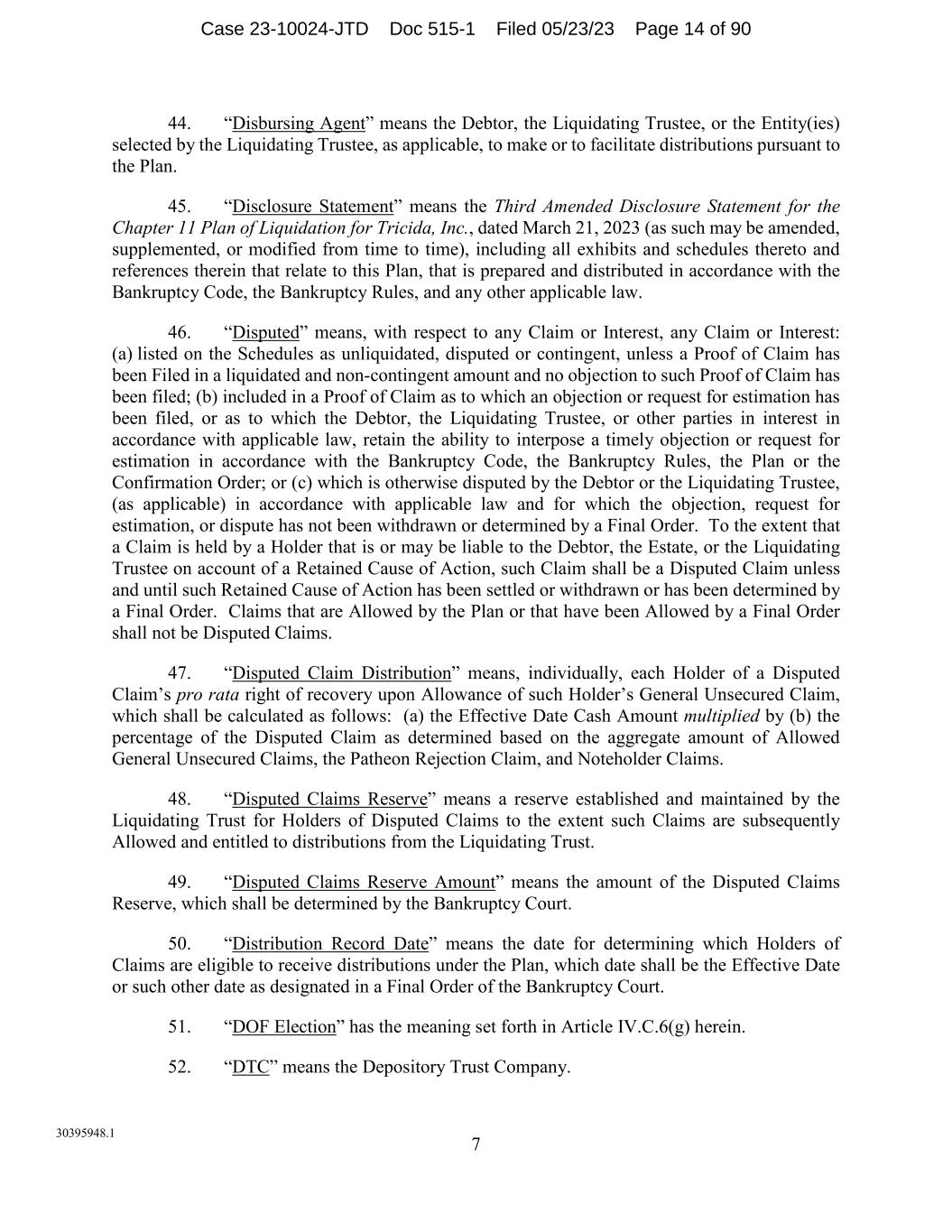 7 30395948.1 44.“支付代理人”是指债务人、清算受托人或清算受托人选定的实体(如适用),根据计划进行分配或为分配提供便利。45.“披露声明”是指2023年3月21日《Tricida, Inc.第11章清算计划的第三次修订披露声明》(该声明可能会不时修订、补充或修改),包括根据《破产法》、《破产规则》和任何其他适用法律编制和分发的与本计划相关的所有证据和附表以及其中的引用。46.“争议”是指就任何债权或利息而言,任何债权或利息:(a)在附表中列为未清偿、有争议或或有条件的债权或利息,除非提交的债权证明的数额为已清偿且非或有数额,且没有人对该债权证明提出异议;(b)在债权证明中列入的债权证明已提出异议或估算请求,或债务人、清算受托人或其他利益相关方根据适用法律提出的债权或利息,保留根据《破产法》、《破产规则》、《计划》或《确认令》及时提出反对或估算请求的能力;或(c)债务人或清算受托人(如适用)根据适用法律提出的其他争议,且反对、估算请求或争议尚未被撤回或由《最终令》确定的。如申索是由因保留的诉讼因由而对债务人、产业或清算受托人负有或可能负有法律责任的持有人提出的,则该申索即为有争议的申索,除非及直至该保留的诉讼因由已获解决或撤回,或已由最后命令裁定为止。本计划允许的或最后命令允许的权利要求不应成为有争议的权利要求。47.“争议债权分配”是指争议债权的每一持有人在允许其一般无担保债权的情况下按比例享有的追偿权,计算方法如下:(a)生效日期现金数额乘以(b)根据允许的一般无担保债权、Patheon驳回债权和票据持有人债权的总额确定的争议债权的百分比。48.“争议债权准备金”是指清算信托为争议债权持有人设立和维持的准备金,其范围是此类债权随后被允许,并有权从清算信托获得分配。49.“争议债权准备金金额”是指争议债权准备金金额,由破产法院裁定。50.“分配记录日期”是指确定哪些债权持有人有资格根据计划获得分配的日期,哪个日期应是生效日期或破产法院最终命令指定的其他日期。51.“自由度选举”具有本文第IV.C.6(g)条所述的含义。52.DTC是指存款信托公司。判例23-10024-JTD Doc 515-1提交05/23/23第14页,共90页