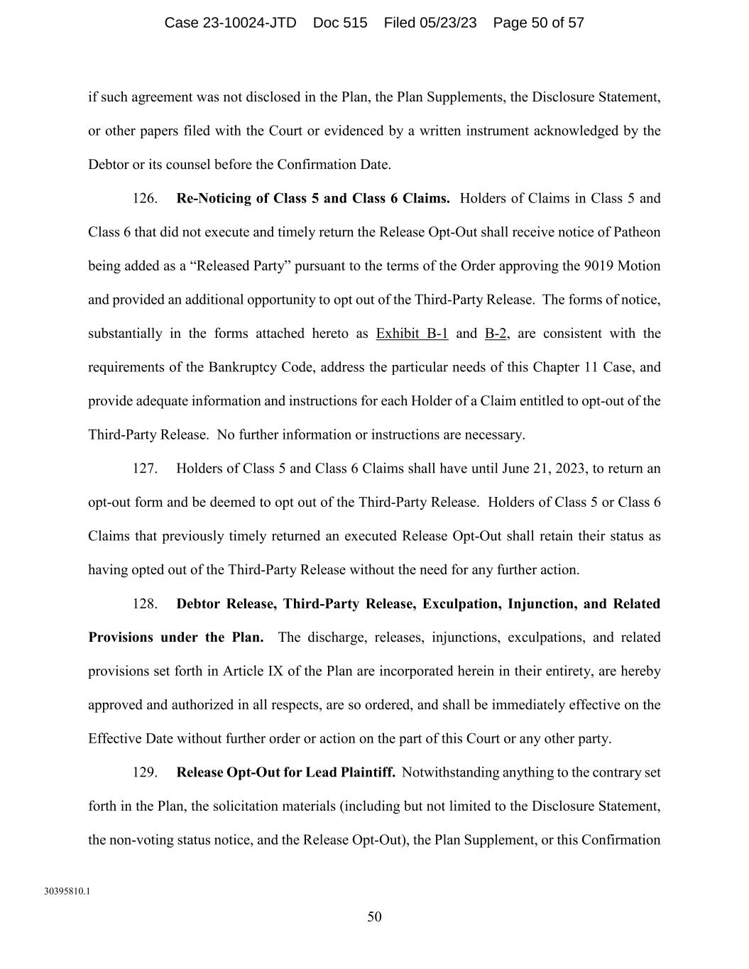 50303958 10.1如果在确认日期之前没有在《计划》、《计划补编》、《披露说明》或向法院提交的其他文件中披露此种协议,或由债务人或其律师承认的书面文书作为证据。126.第5类及第6类申索的重新通知。第5类和第6类债权的持有人如果没有执行并及时退回解除选择退出,应收到通知,根据批准9019动议的命令的条款,Patheon将被添加为“被解除方”,并提供了选择退出第三方解除的额外机会。通知的形式基本上是作为附件 B-1和B-2附在本协议之后的形式,符合《破产法》的要求,满足了第11章案件的特殊需要,并为有权选择退出第三方释放的索赔的每个持有人提供了充分的信息和指示。不需要进一步的资料或指示。127.第5类和第6类索赔的持有人必须在2023年6月21日之前交回一份选择退出表格,并被视为选择退出第三方发布。第5类或第6类债权的持有人先前及时退回已执行的解除选择退出,应保留其已选择退出第三方解除的地位,而无需采取任何进一步行动。128.债务人解除,第三方解除,免责,禁制,以及计划下的相关规定。本计划第九条所载的解除、释放、禁制令、开脱及有关规定,均已全部纳入本计划,并在所有方面获得批准和授权,并已如此命令,并于生效日期起立即生效,而无须本法院或任何其他方面作出进一步命令或采取行动。129.释放主要原告的选择退出。尽管计划中有任何相反的规定,但招标材料(包括但不限于披露声明、无表决权状态通知和发行选择退出)、计划补编或本确认案23-10024-JTD Doc 515提交05/23/23第50页,共57页