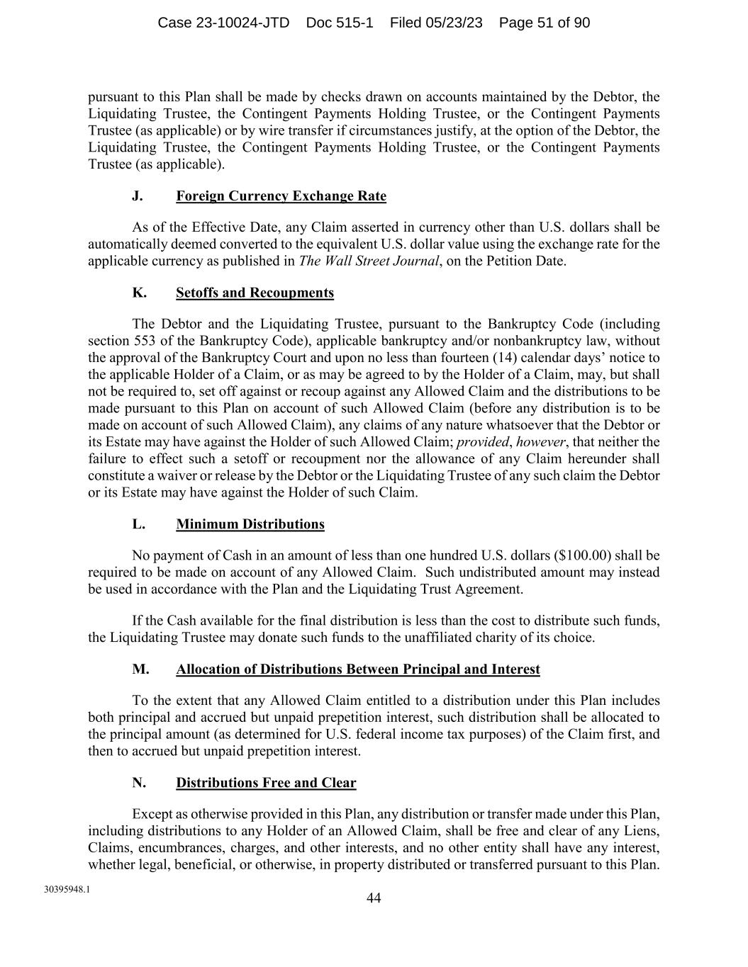 4430395948.1根据本计划,应由债务人、清算受托人、或有付款受托人或或有付款受托人(如适用)在债务人、清算受托人、或有付款受托人或或有付款受托人(如适用)的账户上开出支票,或在情况合理的情况下由债务人、清算受托人、或有付款受托人或有付款受托人(如适用)选择电汇。J.外币兑换率自生效之日起,以美元以外的货币提出的任何索赔,应自动被视为使用申请日《华尔街日报》上公布的适用货币的兑换率换算为等值的美元。债务人和清算受托人根据《破产法》(包括《破产法》第553条)、适用的破产法和/或非破产法,无须经破产法院批准,并在向适用的债权持有人发出不少于十四(14)个历日的通知后,或在债权持有人可能同意的情况下,可以但不应被要求,抵销或补偿任何准许申索及根据本计划因该准许申索而须作出的分配(在因该准许申索而须作出分配前),债务人或其产业可能对该准许申索的持有人提出的任何性质的任何申索,但条件是,如未能作出上述抵销或补偿,亦不容许根据本协议提出的任何索偿,均不构成债务人或清盘受托人放弃或放弃债务人或其产业可能对该索偿的持有人提出的任何该等索偿。L.最低分配不得因任何允许的索赔要求支付少于100美元(100.00美元)的现金。这些未分配的金额可以根据计划和清算信托协议使用。如果可用于最终分配的现金少于分配这些资金的成本,清算受托人可以将这些资金捐赠给其选择的非关联慈善机构。M.本金和利息之间的分配如果根据本计划有权分配的任何允许的索赔包括本金和应计但未支付的申请前利息,这种分配应首先分配到索赔的本金(为美国联邦所得税目的而确定),然后分配到应计但未支付的申请前利息。除本计划另有规定外,根据本计划进行的任何分配或转让,包括向允许债权的任何持有人进行的分配,应不受任何留置权、债权、产权负担、费用和其他权益的影响,任何其他实体不得对根据本计划分配或转让的财产拥有任何权益,无论是合法的、受益的还是其他的。判例23-10024-JTD Doc 515-1提交05/23/23第51页,共90页