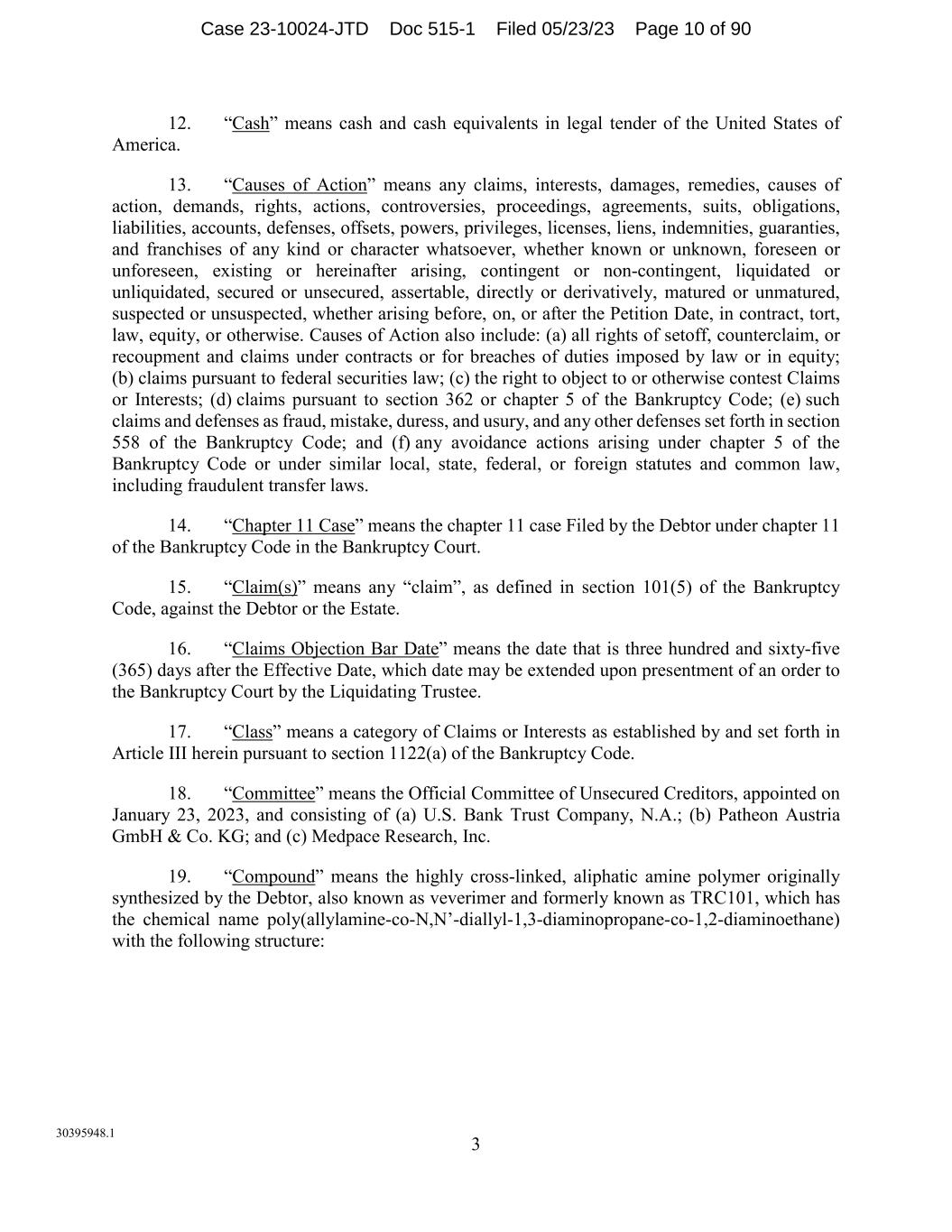 3 30395948.1 12.“现金”是指美国法定货币中的现金和现金等价物。13.“诉讼因由”是指任何索赔、利益、损害赔偿、补救措施、诉讼因由、要求、权利、诉讼、争议、诉讼、协议、诉讼、义务、责任、账目、抗辩、补偿、权力、特权、许可、留置权、赔偿、担保和任何种类或性质的特许经营权,无论已知或未知、预见或不可预见、现有或未来产生、或有或非或有、已清算或未清算、有担保或无担保、可主张、直接或衍生、已到期或未到期、可疑或未怀疑,无论是在请求日之前、当日或之后、合同、侵权、法律、股权或其他方面。诉讼理由还包括:(a)所有抵销权、反索偿权或补偿权,以及根据合同或因违反法律或股权规定的义务而提出的索偿要求;(b)根据联邦证券法提出的索偿要求;(c)对索偿要求或权益提出异议或以其他方式提出异议的权利;(d)根据《破产法》第362条或第5章提出的索偿要求;(e)欺诈、错误、胁迫和高利贷等索偿和抗辩,以及《破产法》第558条所述的任何其他抗辩;以及(f)根据《破产法》第5章或根据类似的地方、州、联邦或外国法规和普通法,包括欺诈性转让法律而产生的任何撤销诉讼。14.“第11章案件”是指债务人根据《破产法》第11章向破产法院提起的第11章案件。15.“债权”是指《破产法》第101(5)条定义的针对债务人或遗产的任何“债权”。16.“债权异议生效日期”是指生效日期后三百六十五(365)天的日期,该日期可在清算受托人向破产法院出示命令后延长。17.“类”是指根据《破产法》第1122(a)条在本文第三条中确立并规定的一类债权或权益。18.“委员会”是指无担保债权人官方委员会,于2023年1月23日任命,由(a)U.S. Bank Trust Company,N.A.;(b)Patheon Austria GmbH & Co. KG;(c)Medpace Research,Inc. 19组成。“化合物”是指最初由债务人合成的高度交联的脂肪胺聚合物,也被称为veverimer,原名TRC101,其化学名称为poly(烯丙胺-co-N,N '-二烯丙基-1,3-二氨基丙烷-co-1,2-二氨基乙烷),结构如下:案例23-10024-JTD文档515-1提交05/23/23第10页,共90页
