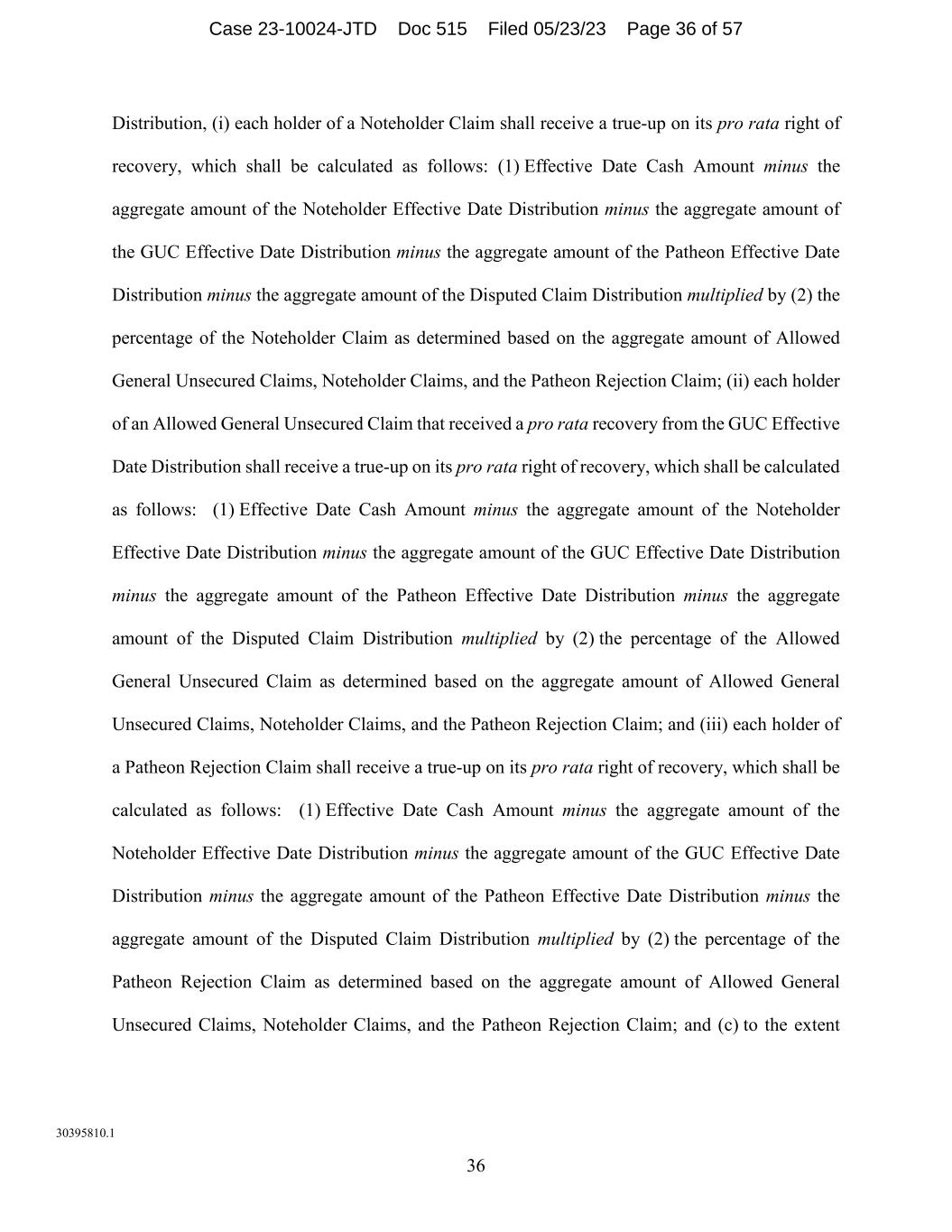 3630395810.1分配,(i)票据持有人索赔的每一持有人应获得其按比例追偿权的校正,其计算方法如下:(1)生效日期现金金额减去票据持有人生效日期分配的总额减去GUC生效日期分配的总额减去Patheon生效日期分配的总额减去争议索赔分配的总额乘以(2)根据允许的一般无担保索赔、票据持有人索赔的总额确定的票据持有人索赔的百分比,和Patheon驳回索赔;(ii)从GUC生效日期分配中获得按比例追偿的获准一般无担保索赔的每一持有人,应获得其按比例追偿权利的更正,计算方法如下:(1)生效日期现金金额减去票据持有人生效日期分配总额减去GUC生效日期分配总额减去Patheon生效日期分配总额减去争议债权分配总额乘以(2)允许的一般无担保债权的百分比,该百分比是根据允许的一般无担保债权、票据持有人债权的总额确定的,及Patheon拒绝债权;及(iii)Patheon拒绝债权的每名持有人应收到一份关于其按比例追偿权的校正,其计算方法如下:(1)生效日期现金金额减去票据持有人生效日期分配总额减去GUC生效日期分配总额减去Patheon生效日期分配总额减去争议债权分配总额乘以(2)Patheon拒绝债权的百分比,该百分比是根据允许的一般无担保债权、票据持有人债权的总额确定的,及Patheon驳回申诉;及(c)在案件23-10024-JTD Doc 515提交05/23/23第36页的情况下