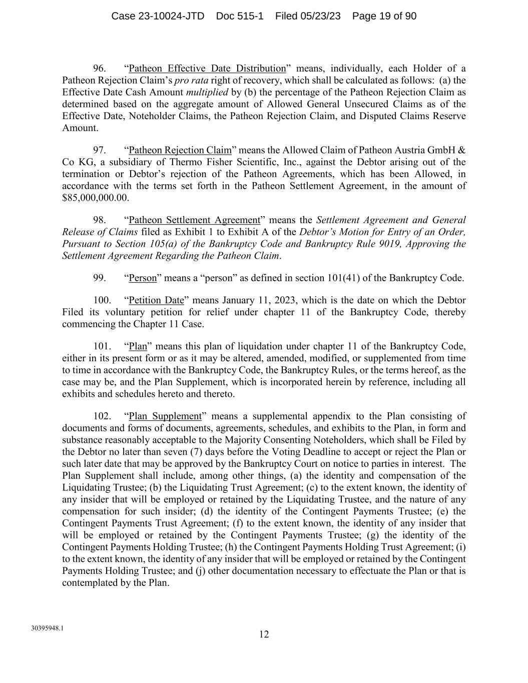 12 30395948.1 96.“Patheon生效日期分配”是指Patheon拒绝债权的每个持有人按比例享有的追偿权,其计算方法如下:(a)生效日期现金金额乘以(b)Patheon拒绝债权的百分比,该百分比是根据截至生效日期允许的一般无担保债权、票据持有人债权、Patheon拒绝债权和争议债权准备金总额确定的。97.“Patheon拒绝索赔”是指赛默飞世尔公司的子公司Patheon Austria GmbH & Co KG因终止或债务人拒绝Patheon协议而对债务人提出的允许索赔,根据Patheon和解协议中规定的条款,允许索赔85,000,000.00美元。98.“Patheon Settlement Agreement”是指根据《破产法》第105(a)条和破产规则第9019条,批准关于Patheon债权的和解协议,作为债务人请求下达命令的附件 A的附件 1提交的和解协议和债权的一般解除。99.“人”是指《破产法》第101(41)条所定义的“人”。100.“申请日期”指2023年1月11日,即债务人根据《破产法》第11章提出自愿救济申请的日期,从而启动第11章案件。101.“计划”是指根据《破产法》第11章规定的清算计划,无论是目前的形式,还是根据《破产法》、《破产规则》或本协议的条款(视情况而定)不时更改、修改、修改或补充的形式,以及以引用方式并入本文的《计划补充》,包括本协议及本协议的所有证据和附表。102.“计划补充”是指计划的补充附录,包括计划的文件和形式、协议、时间表和证据,其形式和内容应为多数同意票据持有人合理接受,债务人应在投票截止日期前七(7)天或破产法院在通知利益相关方后可能批准的更晚日期提交。除其他事项外,计划补充文件应包括:(a)清算受托人的身份和补偿;(b)清算信托协议;(c)在已知范围内,清算受托人将雇用或保留的任何内部人的身份,以及对该内部人的任何补偿的性质;(d)或有付款受托人的身份;(e)或有付款信托协议;(f)在已知范围内,或有付款受托人将雇用或保留的任何内部人员的身份;(g)或有付款持有受托人的身份;(h)或有付款持有信托协议;(i)在已知的范围内,或有付款持有受托人将雇用或保留的任何内部人员的身份;以及(j)实施计划所需或计划所设想的其他文件。判例23-10024-JTD Doc 515-1提交05/23/23第19页,共90页
