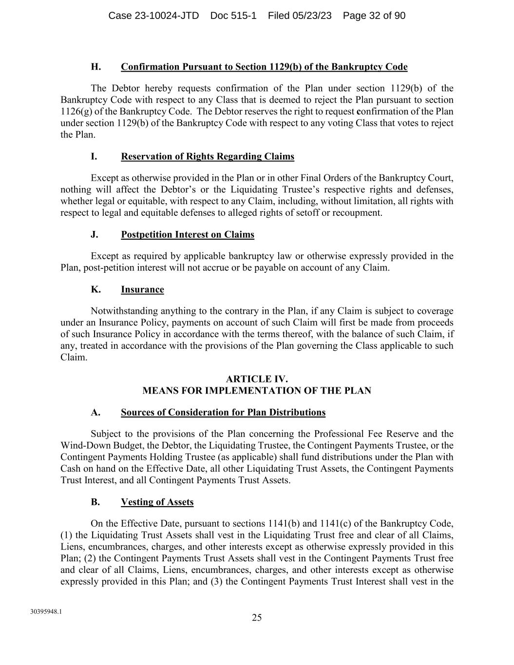 2530395948.1H.根据《破产法》第1129(b)条确认债务人特此请求根据《破产法》第1129(b)条确认根据《破产法》第1129(b)条对任何根据《破产法》第1126(g)条被视为否决该计划的类别的计划。债务人保留根据《破产法》第1129(b)条就投票否决计划的任何投票类别要求确认计划的权利。一.对债权的权利保留除本计划或破产法院的其他最终命令另有规定外,不影响债务人或清算受托人对任何债权的权利和抗辩,无论是合法的还是衡平法的,包括但不限于对所称抵销权或补偿权的法律和衡平法抗辩的所有权利。除适用的破产法或本计划另有明文规定外,申请后的利息将不会因任何申索而产生或须支付。K.保险即使本计划另有相反规定,如任何索偿须受保险单所涵盖的范围所规限,就该索偿而作出的付款,须先按照该保险单的条款,从该保险单的收益中支付,如有任何索偿的余额,则须按照适用于该等索偿的类别的计划的条文处理。第四条。计划实施方式A.计划分配的对价来源在符合计划中有关专业费用准备金和清盘预算的规定的情况下,债务人、清算受托人、或有付款受托人或或有付款持有受托人(如适用)应在计划生效日期用手头现金、所有其他清算信托资产、或有付款信托利息和所有或有付款信托资产为计划下的分配提供资金。根据《破产法》第1141(b)条和第1141(c)条,资产的归属在生效日期,(1)清算信托资产应归属于清算信托,不附带任何债权、留置权、产权负担、押记和其他权益,除非本计划另有明确规定;(2)或有付款信托资产应归属于或有付款信托,不附带任何债权、留置权、产权负担、押记,及其他权益,但本计划另有明文规定的除外;及(3)或有付款信托权益归属于个案23-10024-JTD Doc 515-1提交05/23/23第32页,共90页