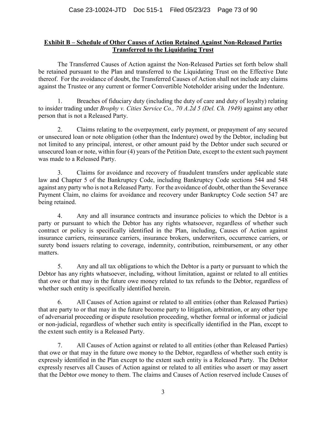 3 附件 B –对转移至清算信托的未获释放各方保留的其他诉讼因由一览表下文列出的对未获释放各方的转移诉讼因由应根据本计划予以保留,并于计划生效之日转移至清算信托。为免生疑问,移交的诉讼因由不包括根据契约对受托人或任何现任或前任可转换票据持有人提出的任何索偿。1.违反Brophy诉Cities Service Co.,70 A.2d5(Del.)案中与内幕交易有关的信托义务(包括注意义务和忠诚义务)。第1949章)针对任何其他不是被释放政党的人。2.与债务人所欠任何有担保或无担保贷款或票据债务(契约除外)的多付、提前付款或提前付款有关的债权,包括但不限于债务人在请求日起四(4)年内根据此类有担保或无担保贷款或票据支付的任何本金、利息或其他金额,但此种付款是支付给被解放方的除外。3.根据适用的州法律和《破产法》第5章,包括《破产法》第544和548条,对不是被解放方的任何一方提出撤销和收回欺诈性转让的要求。为免生疑问,除遣散费申索外,并无保留根据《破产法》第547条提出的撤销及追讨申索。4.债务人作为一方当事人的任何和所有保险合同和保险单,或者债务人根据这些合同和保险单享有任何权利,无论这些合同或保险单是否在本计划中具体指明,包括针对保险公司、再保险公司、保险经纪人、承保人、事故承保人或担保债券发行人的诉讼理由,涉及承保范围、赔偿、分担、偿付或任何其他事项。5.债务人作为当事方的任何和所有税务义务,或债务人根据这些义务享有任何权利的任何和所有税务义务,包括但不限于针对或与所有欠或将来可能欠与向债务人退税有关的款项的实体有关的实体,不论此种实体是否在本文中具体指明。6.针对或涉及作为诉讼、仲裁或任何其他类型的对抗性程序或争端解决程序的当事方或将来可能成为其当事方的所有实体(已解除当事方除外)的所有诉讼因由,不论该实体是否在《计划》中具体指明,除非该实体是已解除当事方。7.针对或涉及所有欠债务人或将来可能欠债务人款项的实体(被释放缔约方除外)的所有诉讼理由,不论该实体是否在《计划》中明确指明,除非该实体是被释放缔约方。债务人明确保留对声称或可能声称债务人欠其款项的所有实体或与之有关的所有诉讼理由。保留的索赔和诉讼因由包括案件原因23-10024-JTD Doc 515-1 Filed 05/23/23第73页,共90页