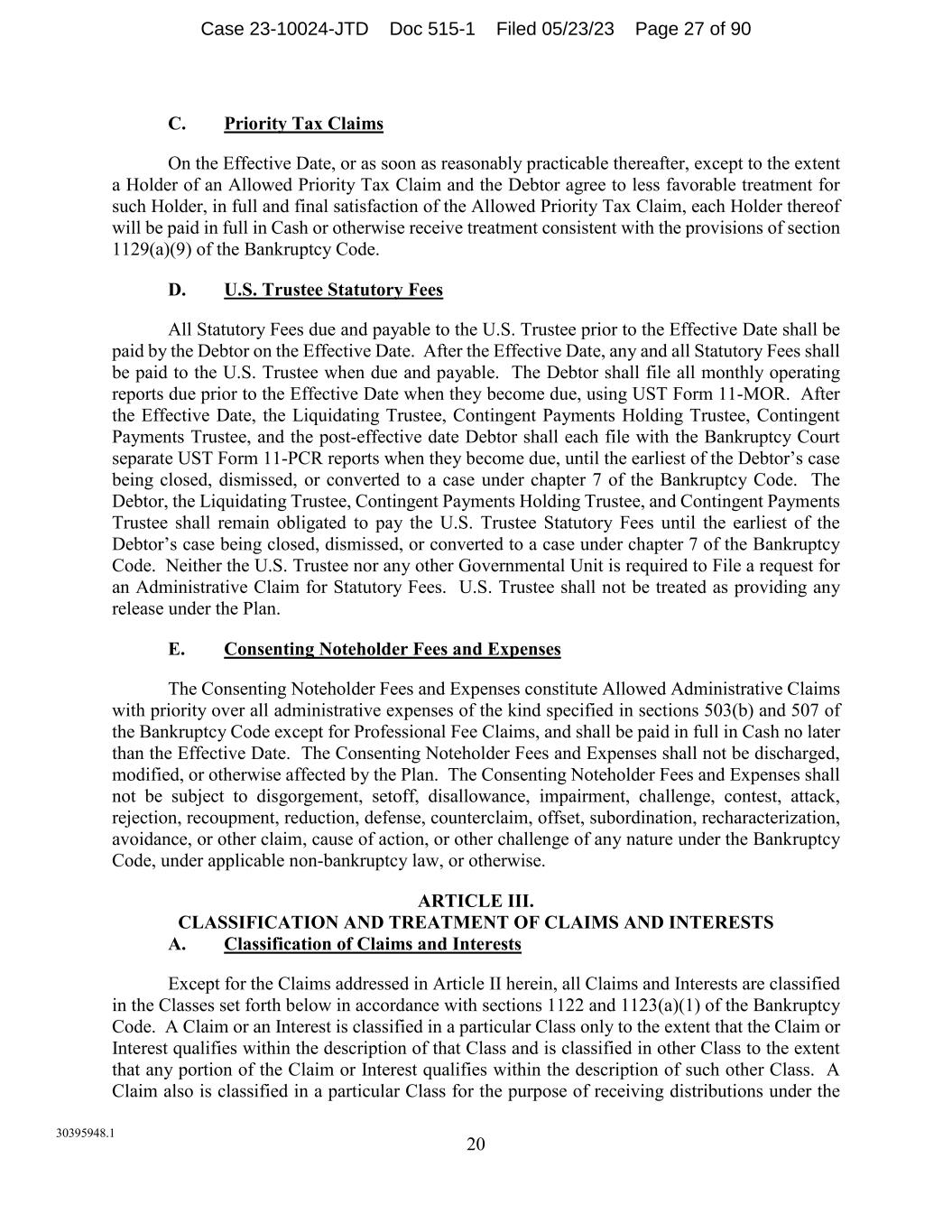 2030395948.1C.优先权税收债权在生效日期,或在合理可行的情况下尽快生效,除非允许优先权税收债权的持有人和债务人同意对该持有人给予较低的优惠待遇,以完全和最终清偿允许优先权税收债权,否则每一持有人将以现金全额支付,或以其他方式获得与《破产法》第1129(a)(9)条的规定一致的待遇。D.美国受托人法定费用在生效日期之前应支付给美国受托人的所有法定费用应由债务人在生效日期支付。在生效日期之后,任何和所有法定费用应在到期和应付时支付给美国受托人。债务人应使用UST表格11-MOR提交在生效日期之前到期的所有月度运营报告。在生效日期之后,清算受托人、持有或有付款的受托人、或有付款的受托人和生效日期之后的债务人应在到期时分别向破产法院提交UST表格11-PCR报告,直至债务人的案件最早结案、被驳回或根据《破产法》第7章转换为案件。债务人、清算受托人、或有付款受托人和或有付款受托人仍有义务向美国受托人支付法定费用,直至债务人的案件最早结案、被驳回或根据《破产法》第7章转为案件。美国受托人或任何其他政府单位都不需要就法定费用提出行政索赔请求。美国受托人不应被视为根据该计划提供任何释放。同意的票据持有人费用和开支同意的票据持有人费用和开支构成允许的行政索偿,优先于《破产法》第503(b)和507条规定的所有行政费用,但专业费用索偿除外,并应在生效日期之前以现金全额支付。同意记事人费用及开支不得由本计划免除、修改或以其他方式受影响。同意的票据持有人费用和开支不应受到追缴、抵销、不允许、减损、质疑、抗辩、攻击、拒绝、补偿、减少、抗辩、反索赔、抵销、从属地位、重新定性、撤销或根据《破产法》、根据适用的非破产法或其他任何性质的其他索赔、诉讼因由或其他质疑。第三条。债权和权益的分类和处理A.债权和权益的分类除本文第二条所述的债权外,根据《破产法》第1122和1123(a)(1)节,所有债权和权益均按下列类别分类。只有当索赔或利息符合某一类别的描述时,索赔或利息才被归类为某一类别,而在索赔或利息的任何部分符合该另一类别的描述时,索赔或利息才被归类为另一类别。索赔也被归入某一类别,以便根据案件23-10024-JTD Doc 515-1收取分配款。提交05/23/23第27页,共90页