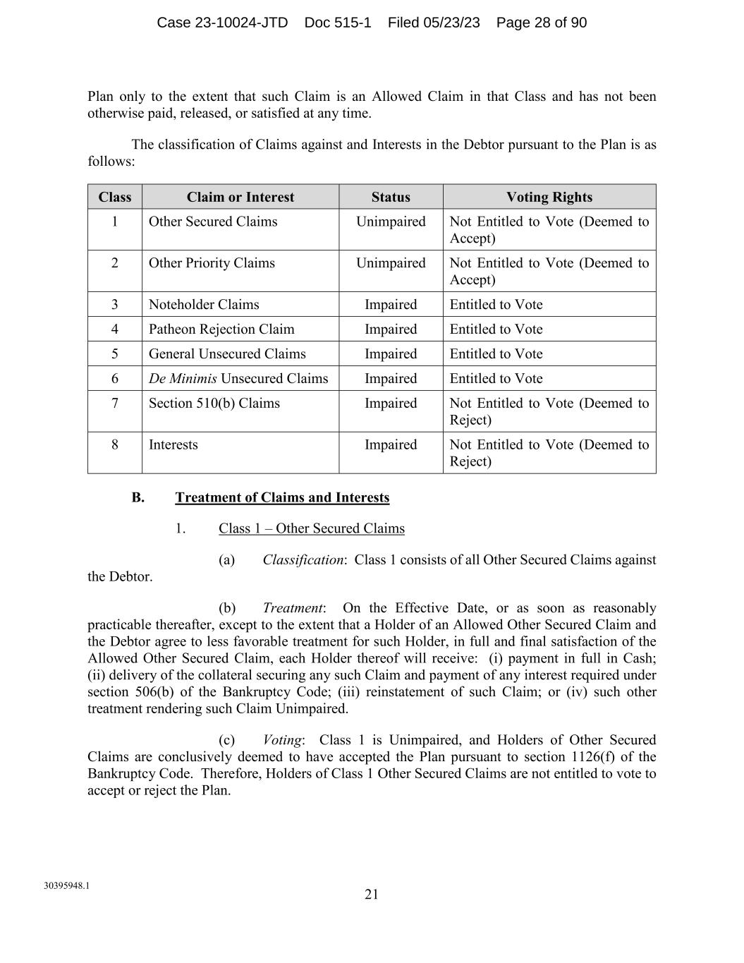 2130395948.1计划仅限于此种索赔属于该类允许索赔,且在任何时候均未以其他方式得到支付、解除或满足的情况。对索赔的分类及根据该计划在债务人的权益为如下:集体债权或权益状况投票权1其他未受损害且无权投票的有担保债权(被视为接受)2其他未受损害且无权投票的优先权债权(被视为接受)3票据持有人债权受损且有权投票的4 Patheon拒绝债权受损且有权投票的5一般无担保债权受损且有权投票的6 De Minimis Unsecured债权受损且有权投票的7第510(b)节受损害且无权投票的债权(被视为拒绝)8受损害且无权投票的权益(被视为拒绝)B.债权和权益的处理1。第1类–其他有担保债权(a)分类:第1类包括针对债务人的所有其他有担保债权。(b)处理:自生效之日起,或在其后合理可行的范围内尽快处理,除非准许的其他有担保债权的持有人与债务人同意给予该持有人较不利的待遇,以完全和最终清偿准许的其他有担保债权,否则该债权的每一持有人将收到:(i)以现金全额付款;(ii)交付担保任何此种债权的担保物,并支付《破产法》第506(b)条规定的任何利息;(iii)恢复此种债权;或(iv)使此种债权不受损害的此种其他处理。(c)表决:第1类是未受损害的,而其他有担保债权的持有人根据《破产法》第1126(f)条被最终视为已接受该计划。因此,第1类其他有担保债权的持有人无权投票接受或否决该计划。判例23-10024-JTD Doc 515-1提交05/23/23第28页,共90页