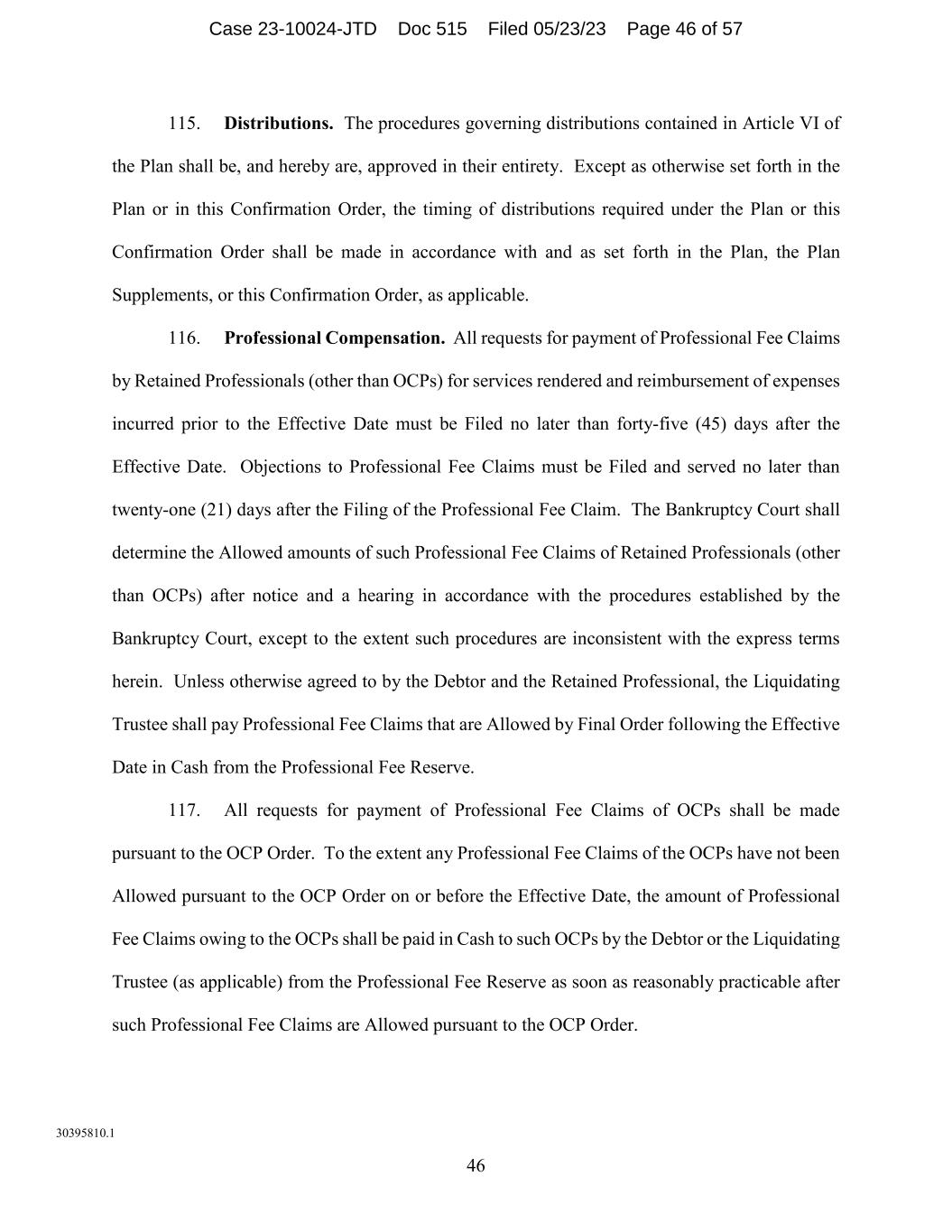46 30395810.1 115.分配。本计划第六条所载的分配程序应全部核准,并在此予以核准。除本计划或本确认令另有规定外,本计划或本确认令所规定的分发时间,须按照本计划、本计划补充本或本确认令(如适用)所规定的时间作出。116.专业报酬。留用专业人员(OCP除外)就生效日期前提供的服务和偿还生效日期前发生的费用提出的所有专业人员费用索偿要求,必须在生效日期后四十五(45)天内提交。对专业费用申索的异议必须在提交专业费用申索后二十一(21)天内提交并送达。破产法院应在按照破产法院规定的程序发出通知和举行听证会后,确定保留专业人员(OCP除外)的此类专业费用索赔的允许金额,但此类程序与本协议的明示条款不一致的除外。除非债务人和留用专业人员另有约定,否则清算受托人应从专业人员费用储备金中以现金支付在生效日期后最终命令允许的专业人员费用索偿。117.所有要求支付OCP的专业费用索赔的请求均应根据OCP令提出。如在该生效日期当日或之前,该等专业费用申索并未根据该等专业费用命令获准,则债务人或清盘受托人(如适用)须在该等专业费用申索根据该等专业费用命令获准后,在合理切实可行范围内尽快从专业费用储备金以现金形式向该等专业费用申索。判例23-10024-JTD Doc 515提交05/23/23第46页,共57页
