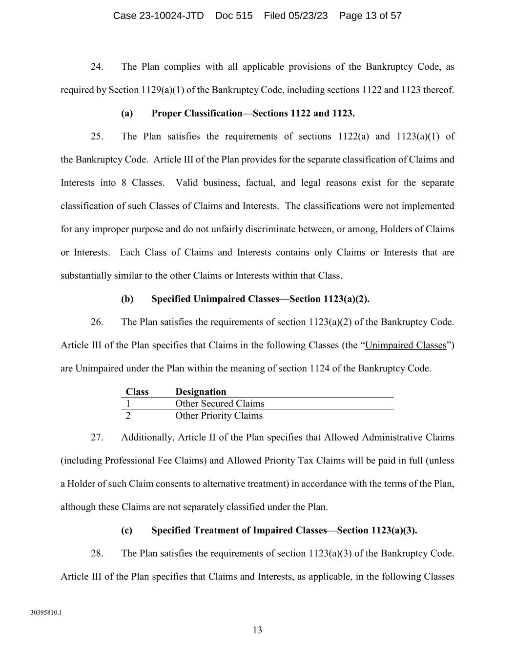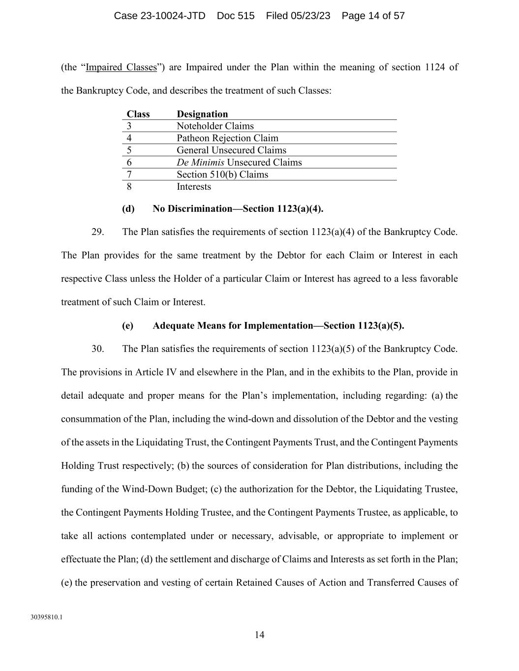 13 30395810.1 24.该计划符合《破产法》第1129(a)(1)条所规定的《破产法》的所有适用条款,包括第1122和1123条。(a)适当分类——第1122和1123条。25.该计划符合《破产法》第1122(a)及1123(a)(1)条的规定。该计划第三条规定将债权和权益单独分为8类。对这类债权和权益进行单独分类,存在有效的商业、事实和法律理由。这些分类并不是出于任何不正当的目的而实施的,也不是对债权或权益持有人进行不公平的区别对待或在他们之间进行不公平的区别对待。每一类债权和权益仅包含与该类别中的其他债权或权益基本相似的债权或权益。(b)指定的未受损害职类——第1123(a)(2)条。26.该计划符合《破产法》第1123(a)(2)条的规定。该计划第三条规定,根据《破产法》第1124条的含义,下列类别(“未受损类别”)的债权在该计划下是未受损的。类别指定1其他有担保债权2其他优先权债权27。此外,《计划》第二条规定,允许的行政索赔(包括专业费用索赔)和允许的优先权税务索赔将按照《计划》的规定全额支付(除非此种索赔的持有人同意采用替代处理办法),尽管这些索赔在《计划》下没有单独分类。(c)受损阶层的具体待遇——第1123(a)(3)节。28.该计划符合《破产法》第1123(a)(3)条的规定。该计划第三条规定,在适用的情况下,在下列类别中的债权和权益案例23-10024-JTD Doc 515提交05/23/23第13页,共57页