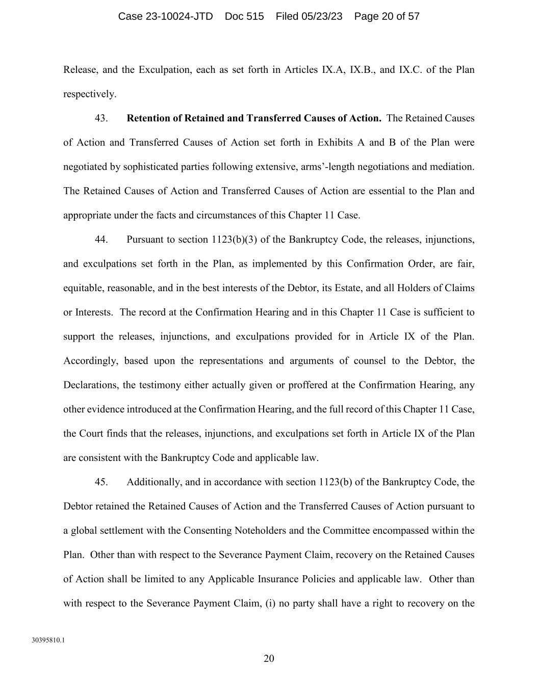 2030395810.1《计划》第IX.A条、第IX.B条和第IX.C条分别规定的释放和免除责任。43.保留和移交的诉讼因由。该计划的附件A和附件B中列出的保留的诉讼理由和移交的诉讼理由是经过广泛的、公平的谈判和调解,由经验丰富的各方谈判达成的。保留的诉讼因由和移交的诉讼因由对本计划至关重要,并且在本第11章案件的事实和情况下是适当的。44.根据《破产法》第1123(b)(3)条,本确认令所执行的本计划所载的释放、强制令和开脱是公平、公正、合理的,并符合债务人、其产业和所有债权或权益持有人的最佳利益。确认听证会和第11章案件中的记录足以支持《计划》第九条规定的释放、禁令和开脱罪责。因此,根据债务人律师的陈述和论点、声明、确认听证会上实际提供或提供的证词、确认听证会上提出的任何其他证据以及第11章案件的完整记录,法院认为,《计划》第九条中规定的释放、禁令和开脱符合《破产法》和适用法律。45.此外,根据《破产法》第1123(b)节,债务人根据与同意票据持有人和计划所包括的委员会达成的全球和解,保留了保留的诉讼因由和移交的诉讼因由。除遣散费索偿外,对保留诉讼因由的追讨应限于任何适用的保险单和适用的法律。(i)除遣散费申索外,任何一方均无权追讨提交05/23/23的第23-10024-JTD Doc 515号案件