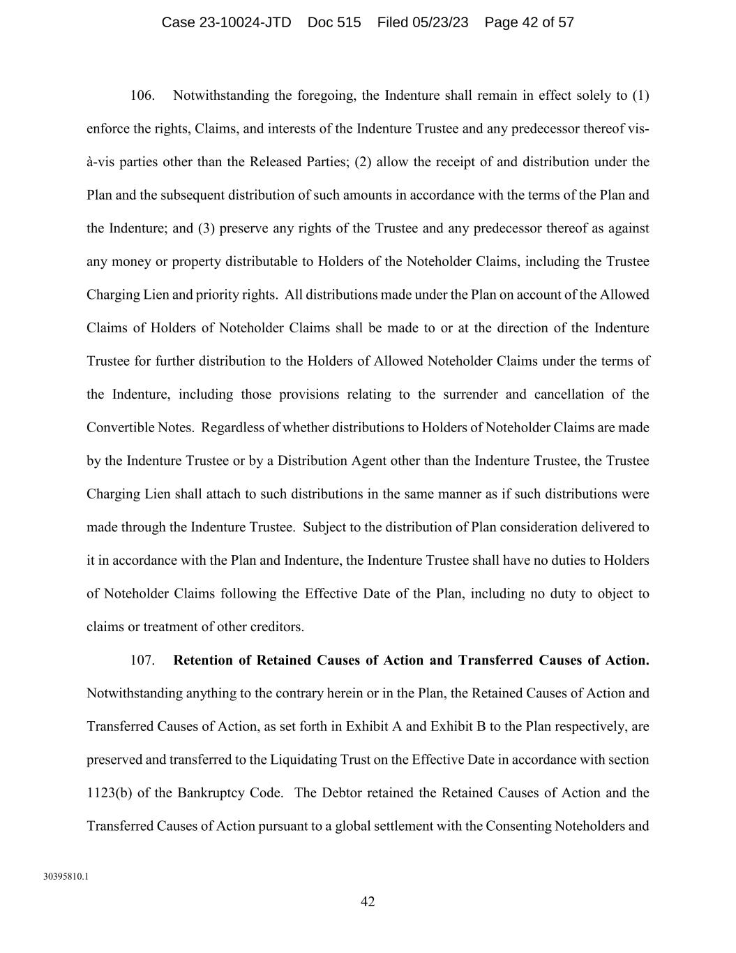 42 30395810.1 106.尽管有上述规定,契约仍然有效的唯一目的是:(1)强制执行契约受托人及其任何前任的权利、索偿要求和利益;(2)允许根据计划收取和分配,以及随后根据计划和契约的条款分配这些金额;以及(3)保留受托人及其任何前任的任何权利,以对抗任何可分配给票据持有人索偿要求持有人的金钱或财产,包括受托人收取留置权和优先权。根据本计划因票据持有人的允许债权而作出的所有分配,均应向契约受托人作出或在契约受托人的指示下作出,以便根据契约条款(包括与交出和注销可转换票据有关的条款)进一步分配给允许票据持有人债权。不论向票据持有人债权的持有人作出的分配是由契约受托人作出的,还是由契约受托人以外的分配代理人作出的,收取留置权的受托人应以与通过契约受托人作出分配相同的方式附加于该等分配。在按照计划和契约向其交付的计划对价分配的情况下,契约受托人在计划生效日期后对票据持有人债权持有人不承担任何责任,包括不对债权提出异议或对其他债权人的待遇。107.保留保留的诉讼因由和转移的诉讼因由。尽管本条例或本计划有任何相反的规定,本计划的附件 A及附件 B分别列出的保留诉讼因由及转移诉讼因由,均按照《破产法》第1123(b)条在生效日期予以保存及转移予清盘信托。债务人根据与同意票据持有人达成的全球和解保留保留的诉讼因由和移交的诉讼因由,案件23-10024-JTD Doc 515提交05/23/23第42页,共57页