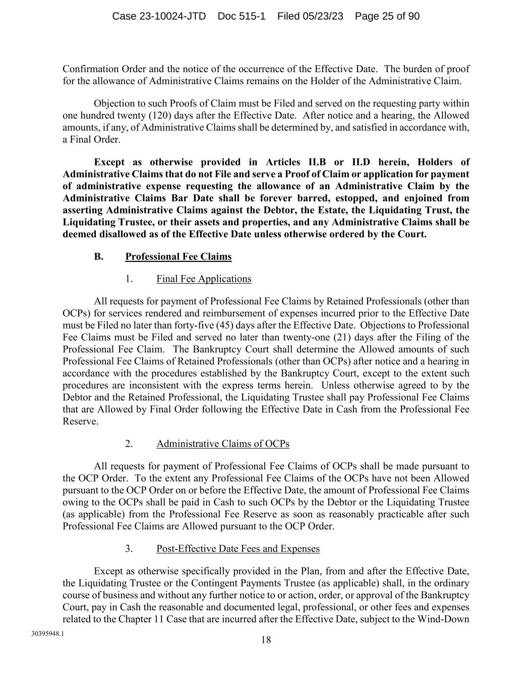 1830395948.1确认令和生效日期发生的通知。行政索偿津贴的举证责任仍由行政索偿持有人承担。对此种索赔证明的异议必须在生效日期后一百二十(120)天内提交并送达请求方。在发出通知和举行聆讯后,行政索偿的准许数额(如有的话)应由最后命令确定,并按照最后命令予以满足。除本条例第II.B条或第II.D条另有规定外,行政债权持有人如在行政债权生效日期前未提交和送达债权证明或申请支付行政费用以请求准许行政债权,应被永远禁止、禁止和禁止对债务人、遗产、清算信托、清算受托人或其资产和财产提出行政债权,除非法院另有命令,否则自生效日期起,任何行政债权应被视为不允许。专业费用索赔1。最后费用申请留用专业人员(OCP除外)就在生效日期之前提供的服务和报销费用提出的所有专业费用申请,必须在生效日期后四十五(45)天内提交。对专业费用申索的异议必须在专业费用申索提交后二十一(21)天内提交并送达。破产法院应在按照破产法院规定的程序发出通知和举行听证会后,确定保留专业人员(OCP除外)的此类专业费用索赔的允许金额,但此类程序与本协议的明示条款不一致的除外。除非债务人和留用专业人员另有约定,否则清算受托人应从专业人员费用储备金中以现金支付在生效日期后最终命令允许的专业人员费用索偿。2.OCP的行政索赔所有要求支付OCP的专业费用索赔的请求均应根据OCP令提出。如在该生效日期当日或之前,该等专业费用申索并未根据该等专业费用命令获准,则债务人或清盘受托人(如适用)须在该等专业费用申索根据该等专业费用命令获准后,在合理切实可行范围内尽快从专业费用储备金以现金形式向该等专业费用申索。3.除计划另有具体规定外,自生效日期起及之后,清算受托人或或有付款受托人(如适用)应在正常业务过程中,在不向破产法院发出任何进一步通知或采取行动、命令或批准的情况下,以现金支付在生效日期之后发生的与第11章案件有关的合理且有文件证明的法律、专业或其他费用和开支,但以清盘案件23-10024-JTD Doc 515-1提交05/23/23第25页,共90页