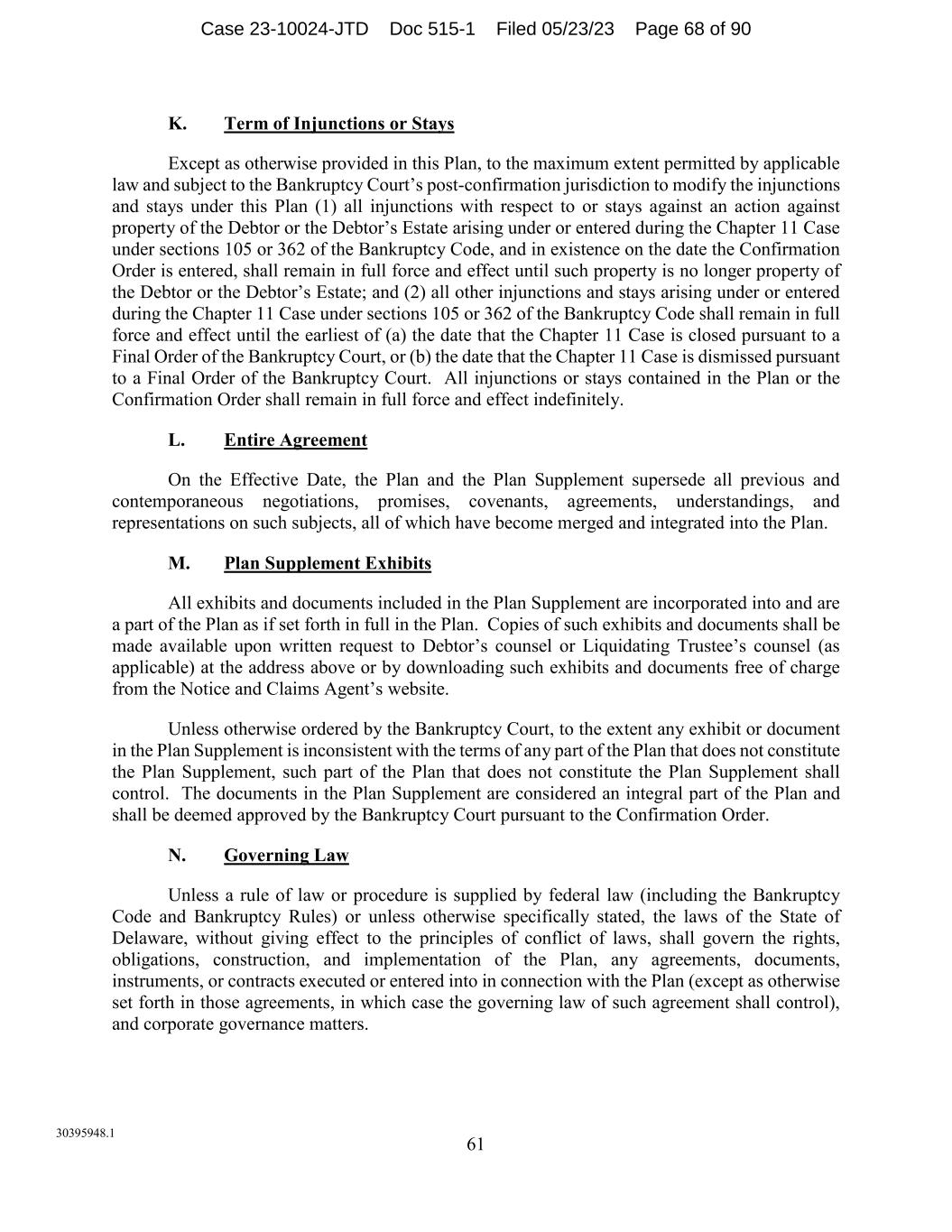 6130395948.1K.禁制令或中止的期限除本计划另有规定外,在适用法律允许的最大限度内,并在符合破产法院确认后司法管辖权的情况下,修改本计划下的禁制令和中止(1)与根据《破产法》第105或362条在第11章案件中产生或进入的针对债务人财产或债务人遗产的诉讼有关的所有禁制令或中止,并在确认令生效之日有效,(2)根据《破产法》第105或362条在第11章案件中根据第11章案件产生或订立的所有其他强制令和中止,在(a)第11章案件根据破产法院的最终命令结案的日期,或(b)第11章案件根据破产法院的最终命令被驳回的日期中最早的日期之前,均保持完全有效。本计划或确认令所载的所有强制令或中止,均须无限期地保持完全有效。L.《全面协议》在生效日期、《计划》和《计划补编》取代以前和当时就这些问题进行的所有谈判、承诺、契约、协议、谅解和陈述,所有这些都已合并并纳入《计划》。M.计划补充文件展品所有列入计划补充文件的展品和文件均已纳入计划,并已成为计划的一部分,犹如计划全文所列一样。应向上述地址的债务人律师或清算受托人律师(视情况而定)提出书面请求,或通过从通知和索赔代理人的网站免费下载这些证据和文件,提供这些证据和文件的副本。除非破产法庭另有命令,否则如图则补编中的任何展品或文件与不构成图则补编的图则任何部分的条款不一致,则图则中不构成图则补编的该部分即属控制。计划补充文件中的文件被视为计划的组成部分,并应被视为由破产法院根据确认令批准。适用法律除非联邦法律(包括《破产法》和《破产规则》)规定了法律规则或程序,或者除非另有具体说明,否则在不影响法律冲突原则的情况下,特拉华州的法律应管辖计划的权利、义务、结构和实施、与计划有关的任何协议、文件、文书或订立的合同(除非这些协议中另有规定,在这种情况下,此种协议的适用法律应予控制)以及公司治理事项。判例23-10024-JTD Doc 515-1提交05/23/23第68页,共90页