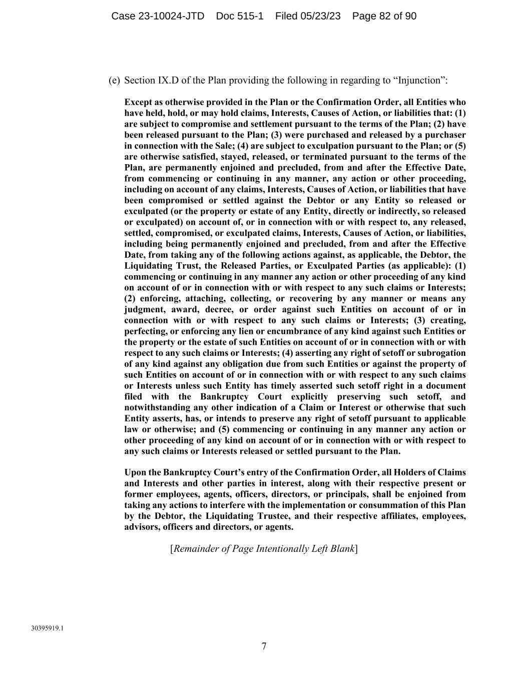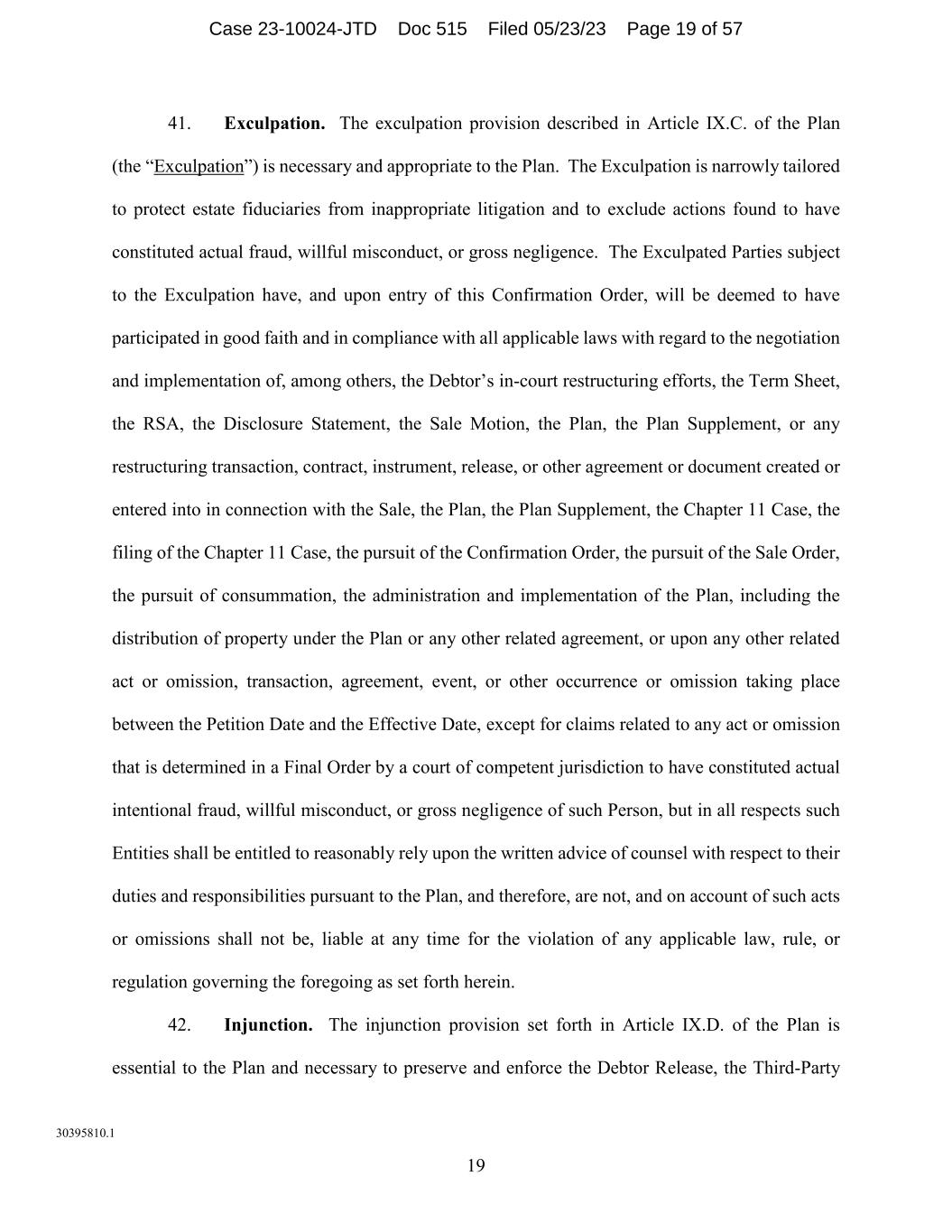 19 30395810.1 41.开脱。计划第IXC条所述的开脱条款(“开脱”)对计划是必要和适当的。免责条款是为了保护遗产受托人免受不适当的诉讼,并排除被认定构成实际欺诈、故意不当行为或重大过失的行为。受免责声明约束的被免责各方在收到本确认令后,将被视为真诚地参与并遵守所有适用的法律,这些法律涉及债务人的庭内重组努力、条款清单、RSA、披露声明、出售动议、计划、计划补充,或与出售、计划、计划补充、第11章案件有关的任何重组交易、合同、文书、解除或其他协议或文件的谈判和执行,提交第11章案件、追索确认令、追索出售令、追索计划的完成、管理和实施,包括根据计划或任何其他相关协议分配财产,或在请愿日期和生效日期之间发生的任何其他相关作为或不作为、交易、协议、事件或其他发生或不作为,但与任何作为或不作为有关的索赔除外,该作为或不作为在有管辖权的法院的最终命令中被确定为构成实际故意欺诈或故意不当行为,或该人的严重疏忽,但在各方面,这些实体应有权就其根据本计划承担的职责和责任合理地依赖律师的书面意见,因此,在任何时候都不对违反本计划规定的任何适用法律、规则或条例的行为承担责任,也不因这些行为或不作为而承担责任。42.禁令。计划第IX.D条规定的禁令条款对计划至关重要,也是维护和执行债务人解除的必要条件,第三方案例23-10024-JTD Doc 515提交05/23/23第19页,共57页