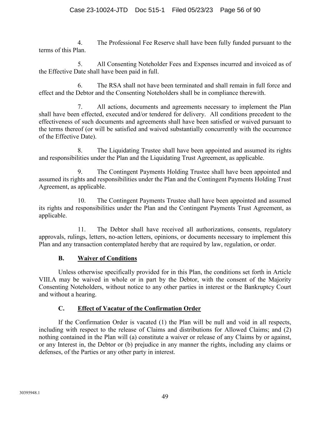 49 30395948.1 4.专业人员费用储备金应已按照本计划的规定全额供资。5.自生效日期起所招致并已开票的所有同意记账员费用及开支,均须已付清。6.RSA不应被终止,应继续完全有效,债务人和同意的票据持有人应遵守RSA。7.执行计划所需的一切行动、文件和协议均应已生效、执行和/或提交交付。此类文件和协议生效的所有先决条件均应已根据其条款得到满足或放弃(或将在生效日期发生时基本同时得到满足和放弃)。8.清算受托人应已被指定并承担其在计划和清算信托协议(如适用)下的权利和责任。9.或有付款持有受托人应已被指定并承担其在计划和或有付款持有信托协议(如适用)下的权利和责任。10.应急支付受托人应已被指定并承担其根据本计划和应急支付信托协议(如适用)享有的权利和责任。11.债务人应已收到所有授权、同意、监管批准、裁决、信函、不采取行动的信函、意见或文件,以执行本计划以及法律、法规或命令所要求的在此设想的任何交易。除非本计划另有具体规定,否则债务人可在多数同意票据持有人同意的情况下,在不通知任何其他利益相关方或破产法院的情况下,在不进行听证的情况下,全部或部分放弃第VII.A条规定的条件。确认令空缺的影响如果确认令被撤销(1)本计划在所有方面都是无效的,包括在免除债权和允许债权的分配方面;(2)本计划所载的任何内容都不会(a)构成放弃或免除债务人提出的任何债权或针对债务人的任何权益,或(b)以任何方式损害当事人或任何其他利益方的权利,包括任何债权或抗辩。判例23-10024-JTD Doc 515-1提交05/23/23第56页,共90页
