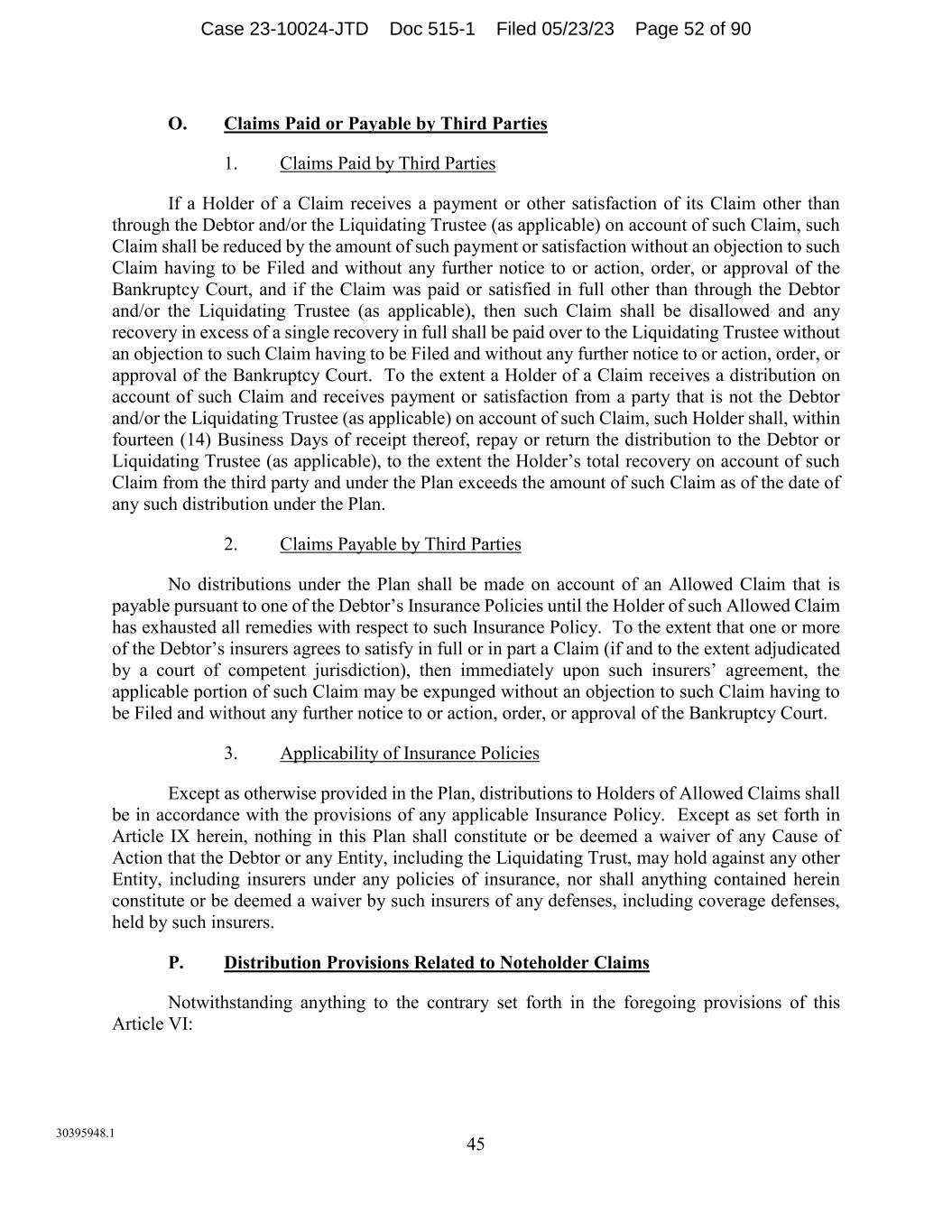 4530395948.1 O.第三方支付或应付的索赔1。第三方支付的债权如果债权持有人因债权而收到非通过债务人和/或清算受托人(视情况而定)支付或以其他方式清偿其债权的款项,则该债权应减去该等付款或清偿的金额,而无需向破产法院提出任何进一步通知或诉讼、命令或批准,且该债权是通过债务人和/或清算受托人(视情况而定)以外的方式全额支付或清偿的,则该项申索即属不容许,而任何超过一项全部的追索权的追索权,均须付予清盘受托人,而无须对该项申索提出异议,亦无须再向破产法庭发出通知或采取行动、作出命令或批准。如债权持有人因该债权而收到分配款项,并因该债权而从并非债务人和/或清算受托人(如适用)的一方收到付款或清偿,则该持有人须在收到该债权后十四(14)个营业日内,将该分配款项偿还或退还债务人或清算受托人(如适用),如果持有人从第三方和根据本计划就此种索赔而获得的赔偿总额超过了根据本计划进行的任何此种分配之日的此种索赔的数额。2.应由第三方支付的索赔不得因根据债务人的一份保险单应支付的允许索赔而根据该计划进行分配,直至此种允许索赔的持有人用尽与此种保险单有关的所有补救办法。如果债务人的一名或多名保险人同意全部或部分偿付一项索赔(如果并在有管辖权的法院裁定的范围内),则在这些保险人达成协议后,可立即删除此种索赔的适用部分,而不必对必须提出此种索赔提出异议,也无须向破产法院发出任何进一步通知或采取行动、命令或批准。3.除本计划另有规定外,保险单的适用范围应按照任何适用的保险单的规定分配给允许索赔的持有人。除本计划第九条规定的情况外,本计划中的任何内容均不构成或被视为对债务人或任何实体(包括清算信托)可能针对任何其他实体(包括任何保险单下的承保人)提出的任何诉讼理由的放弃,本计划中的任何内容也不构成或被视为此类承保人对此类承保人提出的任何抗辩,包括承保范围抗辩的放弃。P.与记名持有人债权有关的分配规定,尽管本条第六条的上述规定有任何相反的规定:判例23-10024-JTD Doc 515-1提交05/23/23第52页,共90页