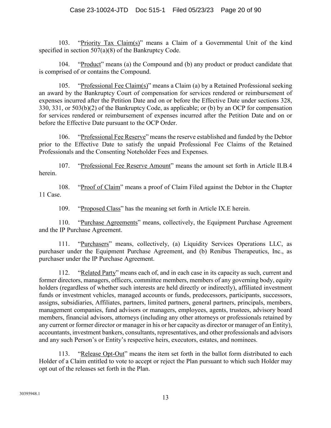 13 30395948.1 103.“优先权税收债权”是指《破产法》第507(a)(8)条规定的政府单位的债权。104.“产品”是指(a)该化合物和(b)由该化合物组成或含有该化合物的任何产品或候选产品。105.“专业费用索偿”是指(a)由一名留任专业人士根据《破产法》第328、330、331或503(b)(2)条(视情况而定)要求破产法庭就在呈请日期后及在生效日期或之前提供的服务或补偿所招致的开支而提出的索偿要求;或(b)由监察委员会就在呈请日期后及在生效日期或之前根据监察委员会命令提供的服务或补偿所招致的开支而提出的索偿要求。106.“专业费用准备金”是指债务人在生效日期之前设立并提供资金的准备金,用于支付留用专业人员未支付的专业费用要求和同意的记账人费用和开支。107.“专业费用储备金额”是指本文第II.B.4条中规定的金额。108.“债权证明”是指在第11章案件中对债务人提出的债权证明。109.“提议的类别”具有本文第IX.E条中所述的含义。110.“购买协议”是指设备购买协议和知识产权购买协议的合称。111.“买方”统称为:(a)流动性服务运营有限责任公司,作为设备采购协议下的买方;(b)Renibus Therapeutics,Inc.,作为知识产权采购协议下的买方。112.“关联方”是指现任和前任董事、经理、高级管理人员、委员会成员、任何理事机构的成员、股东(无论这些权益是直接持有还是间接持有)、关联投资基金或投资工具、管理账户或基金、前任、参与者、继任者、受让人、子公司、关联公司、合伙人、有限合伙人、普通合伙人、委托人、成员、管理公司、基金顾问或经理、雇员、代理人、受托人、顾问委员会成员、财务顾问,律师(包括任何现任或前任董事或经理以实体董事或经理的身份聘用的任何其他律师或专业人员)、会计师、投资银行家、顾问、代表、其他专业人员和顾问以及任何此类人员或实体各自的继承人、遗嘱执行人、遗产和被提名人。113.“解除选择-退出”是指分配给有权投票接受或否决计划的权利要求的每一持有人的投票表中列出的项目,根据该项目,该持有人可以选择退出计划中列出的解除。判例23-10024-JTD Doc 515-1提交05/23/23第20页,共90页