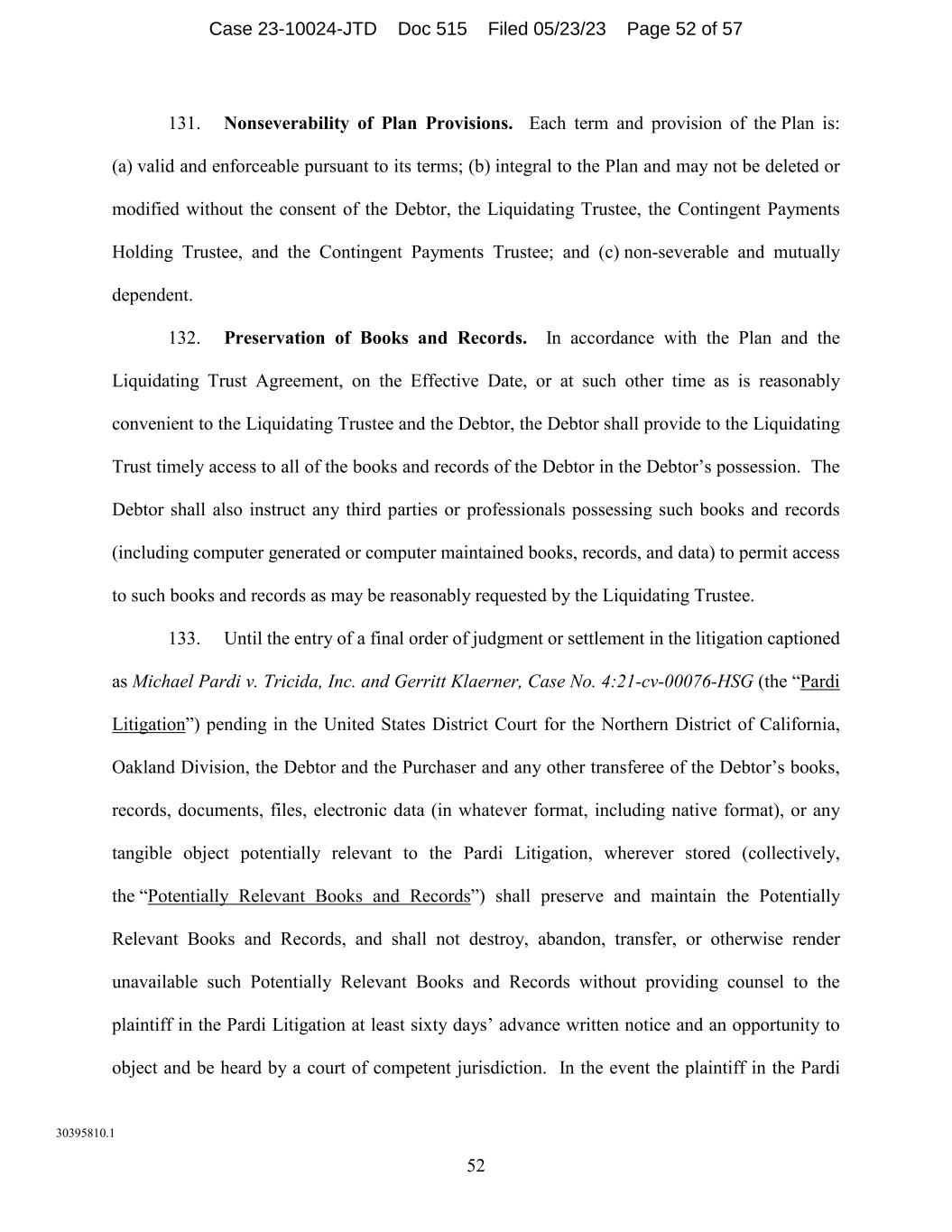 52 30395810.1 131.计划条文的不可分割性。计划的每项条款和规定:(a)根据其条款有效和可执行;(b)计划的组成部分,未经债务人、清算受托人、或有付款持有受托人和或有付款受托人同意,不得删除或修改;(c)不可分离和相互依赖。132.簿册及纪录的保存。根据本计划和清算信托协议,在生效日期或清算受托人和债务人合理方便的其他时间,债务人应向清算信托及时提供查阅债务人所管有的债务人所有簿册和记录的机会。债务人还应指示拥有此类簿册和记录(包括计算机生成或计算机维护的簿册、记录和数据)的任何第三方或专业人员允许查阅清算受托人合理要求的簿册和记录。133.直至在标题为Michael Pardi诉Tricida公司和Gerritt Klaerner案的诉讼中作出最终判决或和解命令,案件编号4:21-cv-00076-HSG(“Pardi诉讼”)在美国加州北区奥克兰地区法院待决,债务人和买方以及债务人的账簿、记录、文件、文件、电子数据(任何格式,包括原生格式)或任何可能与Pardi诉讼相关的有形物品(统称“潜在相关账簿和记录”)应保存和维护潜在相关账簿和记录,不得销毁、放弃、转移或以其他方式使这些可能有关的簿册和记录无法获得,除非事先至少提前六十天书面通知原告并有机会提出异议并由有管辖权的法院审理。Pardi案原告23-10024-JTD Doc 515提交05/23/23第52页,共57页