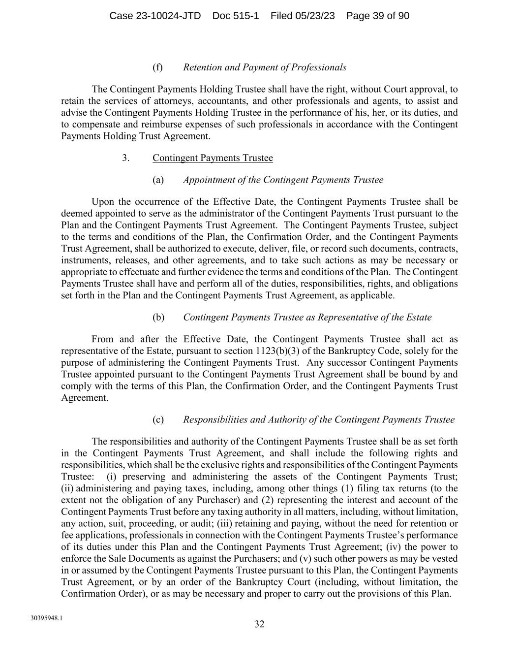 3230395948.1(f)专业人员的保留和支付持有或有付款的受托人应有权在未经法院批准的情况下保留律师、会计师和其他专业人员和代理人的服务,协助或有付款持有受托人履行其职责并向其提供建议,并根据《或有付款持有信托协议》补偿和偿还这些专业人员的费用。3.或有付款受托人(a)或有付款受托人的任命在生效日期发生时,或有付款受托人应被视为根据计划和或有付款信托协议被任命为或有付款信托的管理人。应授权或有付款受托人在遵守计划、确认令和或有付款信托协议的条款和条件的情况下,执行、交付、归档或记录此类文件、合同、文书、释放和其他协议,并采取必要或适当的行动,以执行计划的条款和条件并进一步证明这些条款和条件。应急支付受托人应拥有并履行本计划和应急支付信托协议中规定的所有职责、责任、权利和义务(如适用)。(b)或有付款受托人作为遗产的代表自生效日期起及之后,或有付款受托人应依据《破产法》第1123(b)(3)条,作为遗产的代表,仅为管理或有付款信托的目的。根据或有付款信托协议指定的任何后续或有付款受托人应受本计划、确认令和或有付款信托协议条款的约束和遵守。(c)或有付款受托人的责任和权限或有付款受托人的责任和权限应按照《或有付款信托协议》的规定,并应包括下列权利和责任,这是或有付款受托人的专属权利和责任:(一)保护和管理或有付款信托的资产;(二)管理和支付税款,包括,除其他事项外,(1)提交纳税申报表(以不是任何买方的义务为限)和(2)在所有事项(包括但不限于任何诉讼、诉讼、程序或审计)中代表或有付款信托的利息和账户;(iii)保留和支付,而不需要保留或费用申请,与或有付款受托人履行其在本计划及或有付款信托协议下的职责有关的专业人士;(iv)对买方强制执行销售文件的权力;及(v)或有付款受托人根据本计划、或有付款信托协议或破产法院的命令(包括但不限于确认令)或为执行本计划的规定而可能被赋予或承担的其他权力。判例23-10024-JTD Doc 515-1提交05/23/23第39页,共90页