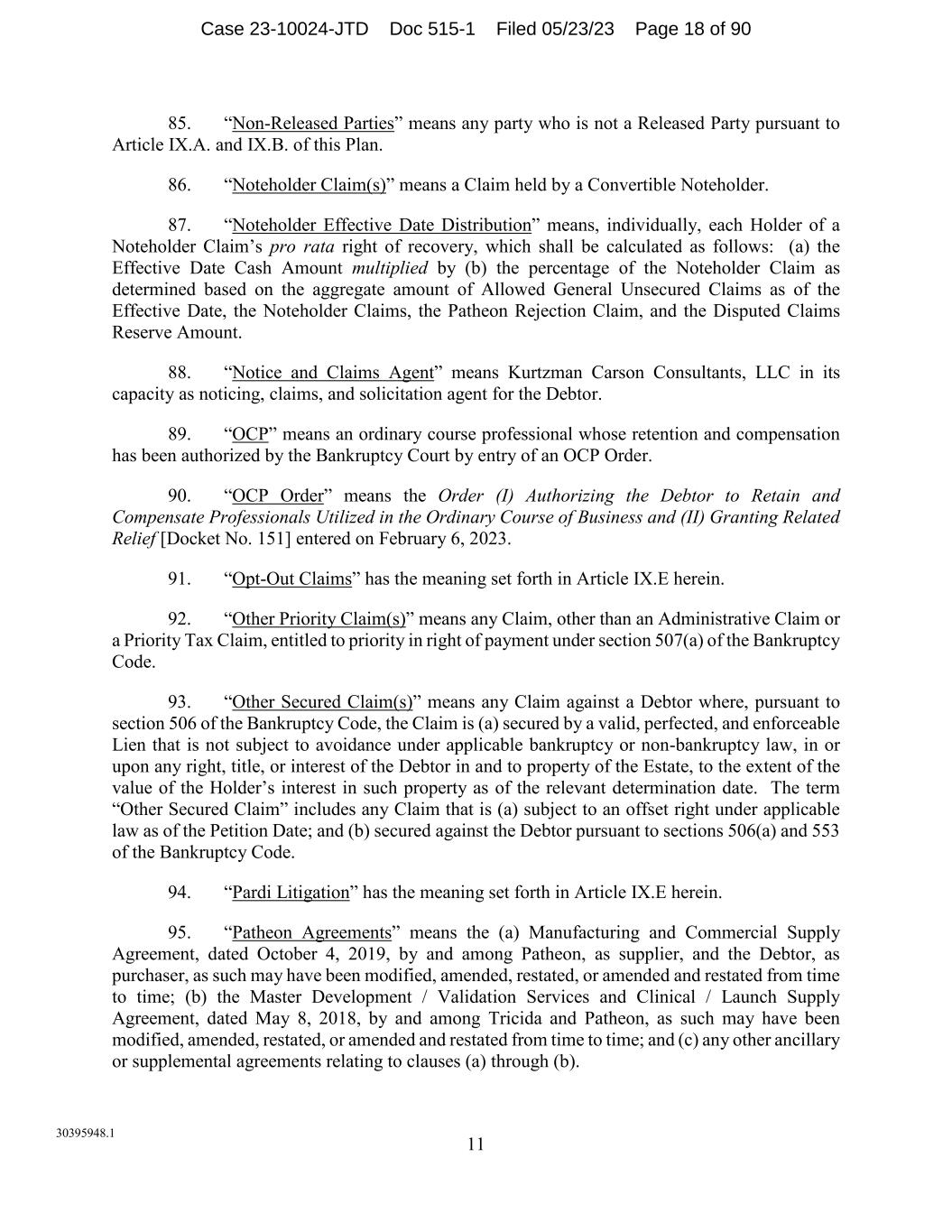 11 30395948.1 85.“未释放方”指根据本计划第IX.A条和第IX.B条不属于释放方的任何一方。86.“票据持有人债权”是指可转换票据持有人持有的债权。87.“票据持有人生效日期分配”是指票据持有人索赔的每个持有人按比例享有的追偿权,其计算方法如下:(a)生效日期现金金额乘以(b)票据持有人索赔的百分比,该百分比是根据截至生效日期允许的一般无担保索赔、票据持有人索赔、Patheon驳回索赔和争议索赔准备金的总额确定的。88.“通知和索偿代理人”是指Kurtzman Carson Consultants,LLC作为债务人的通知、索偿和索偿代理人。89.“OCP”指的是一名普通专业人士,其留用和补偿已获得破产法院的“OCP令”授权。90.“OCP令”是指于2023年2月6日生效的命令(I)授权债务人保留和补偿在正常业务过程中使用的专业人员和(II)给予相关救济[案卷第151号]。91.“选择退出索赔”具有本文第IX.E条所述的含义。92.“其他优先权要求”是指根据《破产法》第507(a)条有权享有优先受付权的除行政债权或优先税收债权以外的任何债权。93.“其他有担保债权”是指针对债务人的任何债权,根据《破产法》第506条,该债权(a)由有效的、完善的和可执行的留置权担保,该留置权不受适用的破产法或非破产法的撤销限制,在债务人对遗产财产的任何权利、所有权或权益上或其上,以持有人在该财产上的权益在相关确定日期的价值为限。“其他有担保债权”一词包括下列任何债权:(a)自申请之日起受适用法律规定的抵销权约束;(b)根据《破产法》第506(a)和553条对债务人作担保。94.“Pardi Litigation”具有本文第IX.E条所述的含义。95.“Patheon协议”是指(a)作为供应商的Patheon和作为买方的债务人之间于2019年10月4日签署的制造和商业供应协议,可能已不时修改、修改、重述或修订和重述;(b)由Tricida和Patheon之间于2018年5月8日签署的主开发/验证服务和临床/发射供应协议,可能已不时修改、修改、重述或修订和重述;以及(c)与(a)至(b)条有关的任何其他附属或补充协议。判例23-10024-JTD Doc 515-1提交05/23/23第18页,共90页