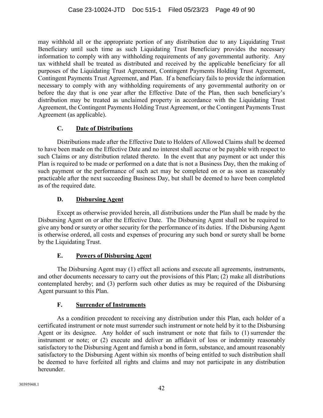 4230395948.1可扣留应付任何清盘信托受益人的全部或适当部分分配款项,直至该清盘信托受益人提供必要资料,以符合任何政府当局的任何扣缴规定为止。为清算信托协议、或有付款持有信托协议、或有付款信托协议和计划的所有目的,任何预扣税款应被视为由适用的受益人分配和收取。如果受益人未能在计划生效日期一年后的当天或之前提供遵守任何政府当局任何扣缴要求所需的信息,则根据《清算信托协议》、《或有付款持有信托协议》或《或有付款信托协议》(视情况而定),该受益人的分配可被视为无人认领的财产。分配日期在生效日期后向准许债权持有人作出的分配,须当作已在生效日期作出,而就该等债权或与之有关的任何分配,不得产生利息或须支付利息。如根据本计划作出的任何付款或作为须在并非营业日的日期作出或履行,则该等付款或作为的履行可于下一个营业日当日或其后在合理切实可行范围内尽快完成,但须当作已于规定日期完成。除本文另有规定外,本计划下的所有分配均应由支付代理在生效日期当日或之后进行。付款代理人无须为履行其职责提供任何保证金或担保或其他担保。如付款代理人另有命令,则购买任何该等债券或保证人的一切费用和开支应由清算信托承担。付款代理人的权力付款代理人可(1)实施所有行动及执行执行执行本计划的规定所需的所有协议、文书及其他文件;(2)进行本计划所设想的所有分配;及(3)履行付款代理人根据本计划所需的其他职责。F.交出票据作为根据本计划收取任何分配款项的先决条件,任何持证票据或单据的持有人必须将其持有的该等票据或单据交还付款代理人或其指定人。任何该等票据或票据的持有人,如不能(1)交出该票据或票据;或(2)签立及交付一份令付款代理人合理满意的损失或弥偿誓章,并在有权获得该等分配的六个月内,提供一份令付款代理人合理满意的形式、实质及款额的保证,即视为丧失所有权利及申索,不得参与根据本协议作出的任何分配。案件23-10024-JTD Doc 515-1提交05/23/23第49页,共90页