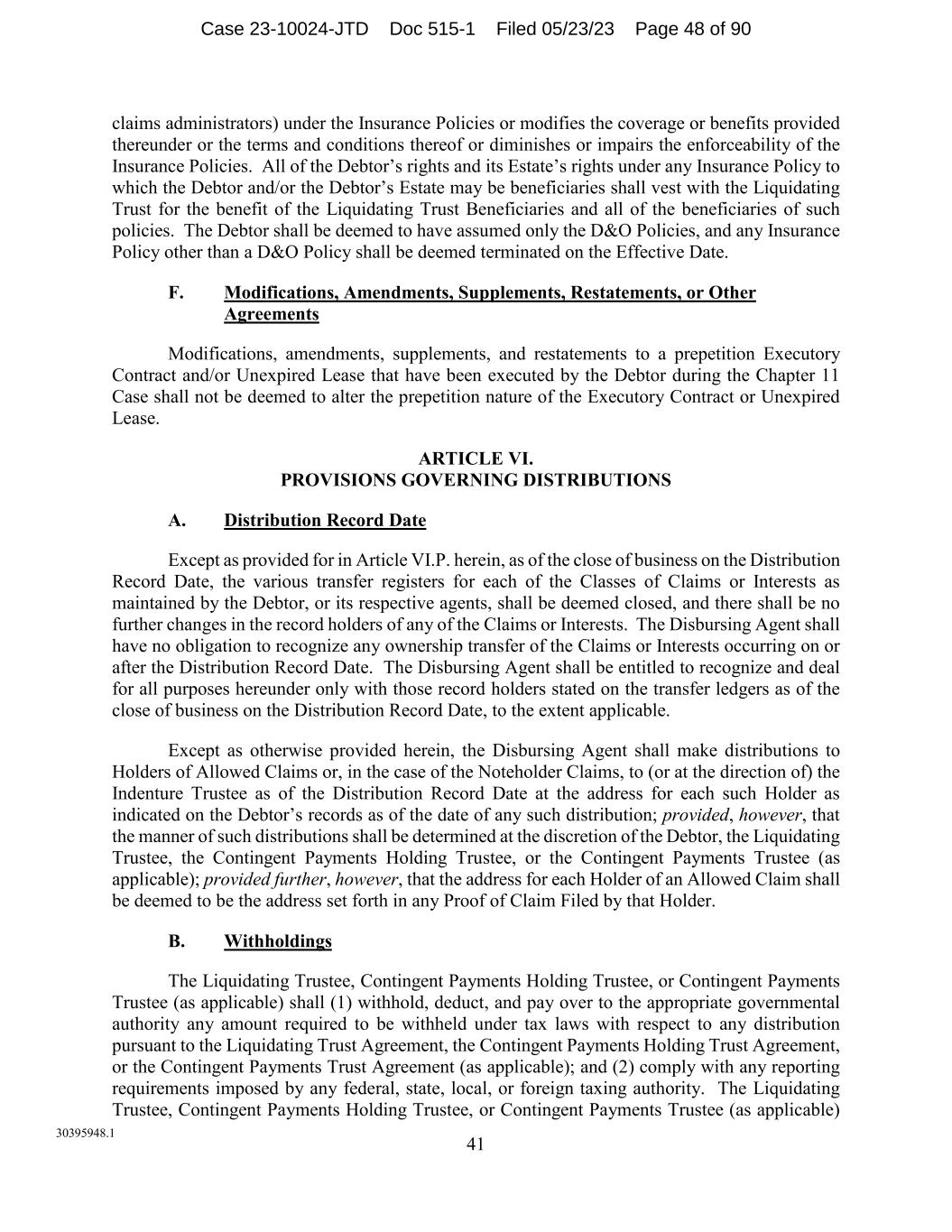4130395948.1索赔管理人)根据《保险单》或修改根据《保险单》提供的保险范围或福利或其条款和条件,或削弱或损害《保险单》的可执行性。债务人和/或债务人遗产可能成为受益人的任何保险单所规定的债务人的所有权利及其遗产的权利,均应归属清算信托,以便清算信托受益人和该等保险单的所有受益人受益。债务人应被视为仅承担了D & O保单,除D & O保单之外的任何保单应被视为在生效日期终止。F.修改、修正、补充、重述或其他协议债务人在第11章案件期间对申请前执行合同和/或未到期租约所作的修改、修正、补充和重述,不应被视为改变了申请前合同或未到期租约的性质。第六条。A.分配记录日期除本条第六款另有规定外,自分配记录日期营业时间结束时起,债务人或其各自的代理人为每一类债权或权益保存的各种转移登记册应视为已关闭,任何债权或权益的记录持有人不得再有任何变动。付款代理人没有义务承认在分配记录日期或之后发生的债权或权益的任何所有权转移。在适用的范围内,付款代理人仅有权为本协议项下的所有目的确认和处理在分配记录日期营业结束时在转移分类账上注明的记录持有人。除本文另有规定外,付款代理人应在分配记录日期向允许债权的持有人进行分配,或在票据持有人债权的情况下,向(或在其指示下)义齿受托人进行分配,地址应为截至分配日期债务人记录上注明的每一位持有人的地址;但此种分配的方式应由债务人、清算受托人、或有付款持有受托人或或有付款受托人(如适用)酌情决定;但另有规定,准许申索的每名持有人的地址,须当作该持有人提交的任何申索证明所载的地址。清算受托人、持有或有付款的受托人或或有付款的受托人(如适用)应(1)根据清算信托协议、或有付款持有信托协议或或有付款信托协议(如适用),扣留、扣除或向相应的政府机构支付税法要求的任何分配款项;(2)遵守任何联邦、州、地方或外国税务机构规定的报告要求。清算受托人、持有或有付款的受托人或或有付款的受托人(如适用)案例23-10024-JTD Doc 515-1提交05/23/23第48页,共90页