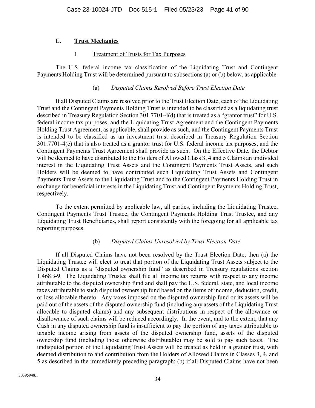 3430395948.1 E.信任机制1。信托的税务处理清算信托和或有付款持有信托的美国联邦所得税分类将根据以下(a)或(b)小节(如适用)确定。(a)在信托选举日期之前解决的有争议债权如果所有有争议债权在信托选举日期之前解决,清算信托和或有付款持有信托均拟被归类为财政部条例第301.7701-4(d)节所述的清算信托,在美国联邦所得税方面被视为“设保人信托”,清算信托协议和或有付款持有信托协议(如适用)应这样规定,或有付款信托计划被归类为财政部条例第301.7701-4(c)节所述的投资信托,也被视为美国联邦所得税目的的设保人信托,或有付款信托协议应作此规定。在生效日期,债务人将被视为已将清算信托资产和或有付款信托资产的不可分割权益分配给允许的第3类、第4类和第5类债权的持有人,而这些持有人将被视为已将清算信托资产和或有付款信托资产分别贡献给清算信托和或有付款持有信托,以换取清算信托和或有付款持有信托的实益权益。在适用法律允许的范围内,所有各方,包括清算受托人、或有付款信托受托人、或有付款持有信托受托人和任何清算信托受益人,在所有适用的报税目的上均应按照上述规定提交报告。(b)通过信托选举日期未解决的有争议债权如果所有有争议债权在信托选举日期前未得到解决,则(a)清算受托人将选择将受争议债权约束的清算信托资产的这一部分视为财务处条例第1.468B-9节所述的“有争议所有权基金”。清算受托人应就归属于争议所有权基金的任何收入提交所有所得税申报表,并应根据可分配给该争议所有权基金的收入、扣除、贷项或损失项目,缴纳归属于该争议所有权基金的美国联邦、州和地方所得税。对有争议的所有权基金或其资产征收的任何税款将从有争议的所有权基金的资产(包括清算信托可分配给有争议债权的任何资产)中支付,随后对此种债权的备抵或不备抵的任何分配将相应减少。如果任何有争议所有权基金中的任何现金不足以支付由争议所有权基金的资产产生的应纳税所得应缴税款的部分,则可出售争议所有权基金的资产(包括其他可分配的资产)以支付此类税款。清算信托资产的无争议部分将被视为设保人信托持有,视同分配给第3、4和5类允许债权持有人并由其分担,如上一段所述;(b)如果所有有争议债权都不是个案23-10024-JTD Doc 515-1提交05/23/23第41页,共90页