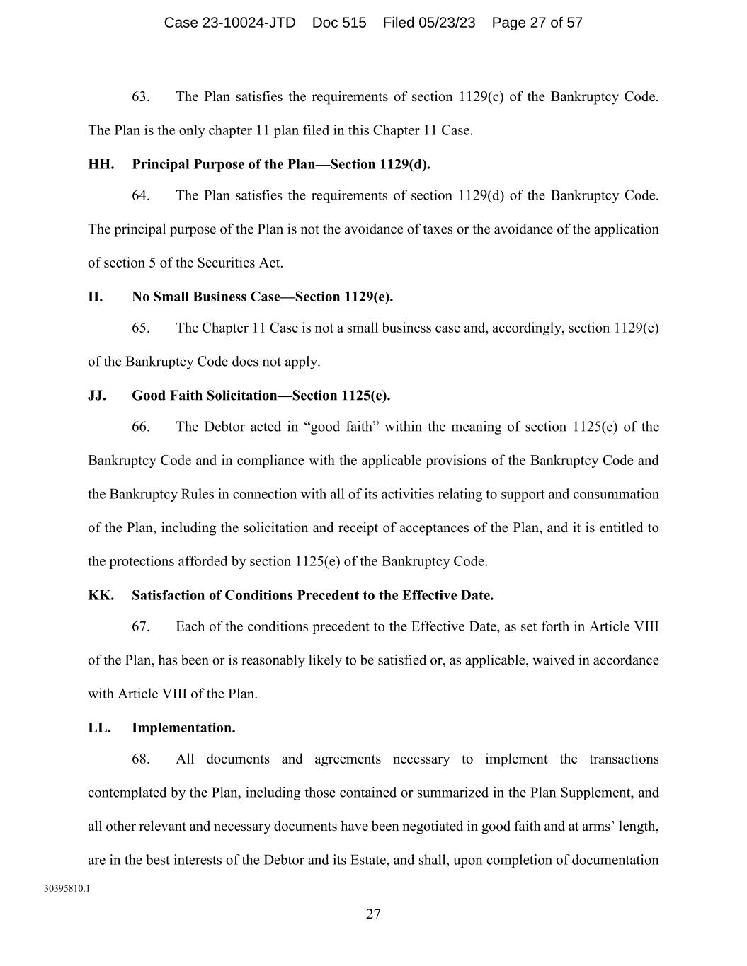 27 30395810.1 63.该计划符合《破产法》第1129(c)条的规定。该计划是在第11章案件中提交的唯一第11章计划。HH。计划的主要目的——第1129(d)节。64.该计划符合《破产法》第1129(d)条的规定。该计划的主要目的不是避税或避免适用《证券法》第5节。ii.无小企业案——第1129(e)节。65.第11章案件不是小企业案件,因此,《破产法》第1129(e)条不适用。JJ. JJ. JJ. JJ. JJ. JJ. JJ. JJ. JJ. JJ. JJ. JJ. JJ. JJ. JJ. JJ. JJ. JJ. JJ. JJ. JJ. JJ. JJ. JJ. JJ. JJ. JJ. JJ. JJ. JJ. JJ. JJ. JJ. JJ. JJ. JJ. JJ. JJ. JJ. JJ. JJ。善意征集——第1125(e)节。66.债务人以《破产法》第1125(e)条所指的“善意”行事,并遵守《破产法》和《破产规则》的适用条款,从事与支持和完成计划有关的所有活动,包括征求和接收计划的接受,债务人有权享受《破产法》第1125(e)条所提供的保护。KK。满足生效日期之前的先决条件。67.《计划》第八条规定的生效日期的先决条件中的每一项条件都已得到满足或有合理可能得到满足,或在适用的情况下根据《计划》第八条予以放弃。LL。执行。68.执行计划所设想的交易所需的所有文件和协议,包括计划补编所载或概述的文件和协议,以及所有其他相关和必要的文件,都是经过真诚和公平协商的,符合债务人及其遗产的最佳利益,并应在完成文件编制后,将案号23-10024-JTD Doc 515提交05/23/23第27页,共57页