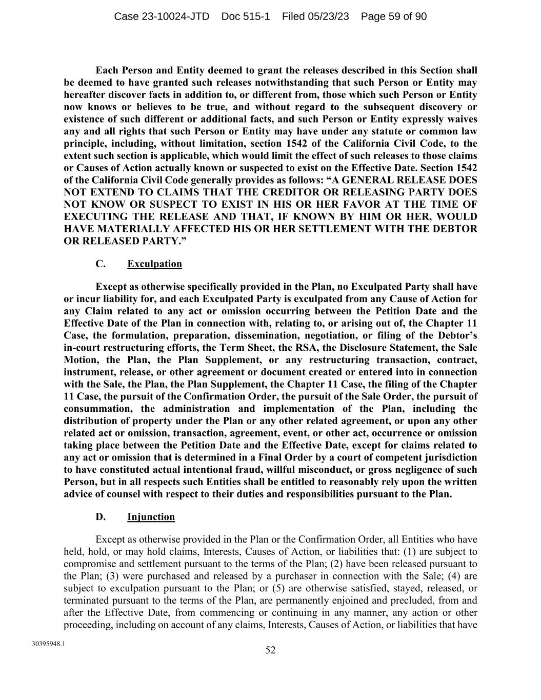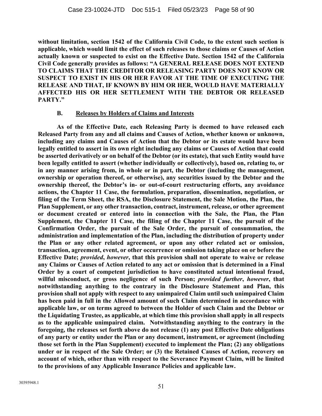 5130395948.1不受限制,《加利福尼亚民法典》第1542条,在适用的范围内,这一条将把这种释放的影响限制于在生效日期实际已知或怀疑存在的索赔或诉讼理由。《加利福尼亚民法典》第1542条一般规定如下:“一般释放不适用于声称债权人或释放方在执行释放时不知道或怀疑以他或她的名义存在,并且如果他或她知道,将对他或她与债务人或释放方的和解产生重大影响。”自生效之日起,每一释放方被视为已解除每一释放方的任何和所有已知或未知的索偿要求和诉讼理由,包括债务人或其遗产在法律上本应有权主张的任何索偿要求和诉讼理由,包括可以派生或代表债务人(或其遗产)主张的任何索偿要求或诉讼理由,该实体在法律上本应有权主张(无论是单独或集体地),基于,与债务人发行的任何证券及其所有权、债务人的庭内或庭外重组努力、任何撤销诉讼、第11章案件、条款清单、RSA、披露声明、出售动议、计划、计划补充文件或与出售、计划补充文件有关的任何其他交易、合同、文书、解除或与出售、计划补充文件有关的其他协议或文件的拟订、编制、传播、谈判或备案有关,或以任何方式由债务人发行的任何证券及其所有权、债务人的庭内或庭外重组努力、任何撤销诉讼,第11章案件、第11章案件的提交、确认令的执行、出售令的执行、计划的完成、管理和实施,包括计划或任何其他相关协议下的财产分配,或在生效日期或之前发生的任何其他相关作为或不作为、交易、协议、事件或其他发生或不作为,但前提是,本条文的作用不应是放弃或解除与任何作为或不作为有关的任何索偿要求或诉讼因由,而该作为或不作为是由有管辖权的法院在一项最终命令中确定构成该人的实际故意欺诈、故意不当行为或重大过失的;但进一步规定,尽管披露声明和计划中有任何相反的规定,本条文不应适用于任何未受损害的索偿要求,直至该未受损害的索偿要求按照适用法律所确定的允许的索赔金额全额得到偿付,或按照此种债权的持有人与债务人或清算受托人之间商定的条件(视情况而定),在此期间,本条规定应在所有方面适用于所适用的未受损害债权。尽管上述规定有任何相反的规定,上述解除并不解除(1)任何一方或实体根据本计划或为执行本计划而签立的任何文件、文书或协议(包括本计划补充文件所列的文件、文书或协议)所承担的任何生效日期后的义务;(2)根据售货令或就售货令所承担的任何义务;或(3)保留的诉讼因由,其追讨将限于任何适用的保险单和适用的法律的规定,但与遣散费索赔有关的追讨除外。判例23-10024-JTD Doc 515-1提交05/23/23第58页,共90页