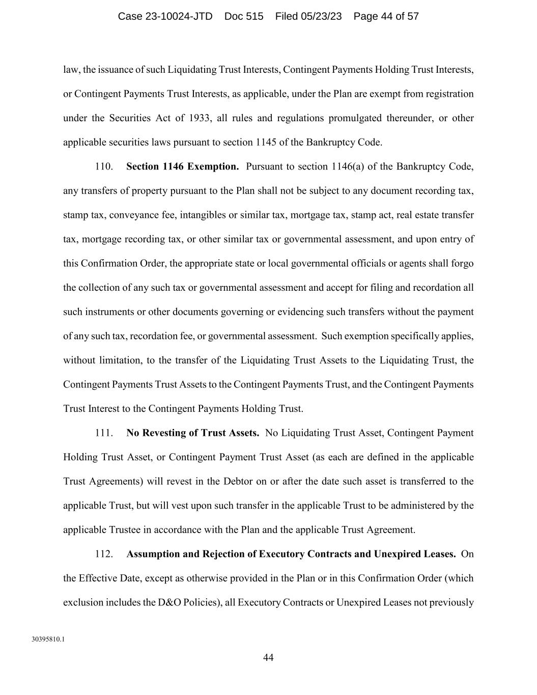 4430395810.1法律规定,根据计划发行此类清算信托权益、持有信托权益的或有付款或或有付款信托权益(如适用),根据1933年《证券法》、根据该法颁布的所有规则和条例,或根据《破产法》第1145条颁布的其他适用证券法,免于登记。110.第1146条豁免。根据《破产法》第1146(a)条的规定,依据本计划进行的任何财产转让,均无须缴付任何单据记录税、印花税、转易费、无形资产或类似税、按揭税、印花税法、不动产转让税、按揭税或其他类似税或政府评估,而在本确认令生效后,适当的州或地方政府官员或代理人应放弃征收任何此类税款或政府评估,并接受所有此类文书或其他规范或证明此类转移的文件进行归档和记录,而无需支付任何此类税款、记录费或政府评估。此种豁免具体适用于但不限于将清算信托资产转移至清算信托、将或有付款信托资产转移至或有付款信托以及将或有付款信托利息转移至或有付款持有信托。111.不转让信托资产。任何清算信托资产、或有付款持有信托资产或或有付款信托资产(在适用的信托协议中均有定义)均不会在此类资产转移至适用的信托之日或之后重新归属于债务人,但在此类转移后将归属于适用的信托,由适用的受托人根据计划和适用的信托协议管理。112.执行合同和未到期租约的承担和拒绝。在生效日期,除本计划或本确认令(不包括D & O政策)另有规定外,所有执行合约或未到期租约之前没有的情况23-10024-JTD Doc 515已提交05/23/23第44页,共57页