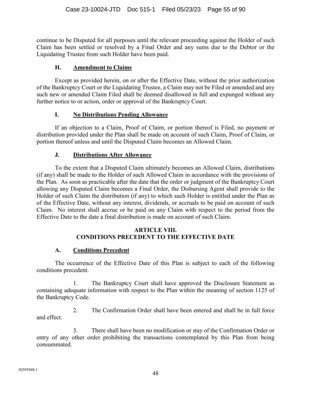 4830395948.1就所有目的而言,争议继续存在,直至针对该债权持有人的有关法律程序以最后命令解决或解决,以及该持有人应付债务人或清算受托人的任何款项已付清为止。H.对债权的修订除非本条例另有规定,否则在生效日期当日或之后,未经破产法院或清算受托人事先授权,不得提出或修订债权,而任何新提出或修订的债权,均须视为完全不获批准,并在没有向破产法院发出任何进一步通知或采取行动、命令或批准的情况下予以删除。一、不分配待发津贴如果对某项索赔、索赔证明或其部分提出异议,则不得因该索赔、索赔证明或其部分而根据本计划提供付款或分配,除非并直至该有争议的索赔成为允许的索赔。J.备抵后的分配如果有争议的权利要求最终成为允许的权利要求,则应按照本计划的规定向允许的权利要求的持有人进行分配(如果有的话)。在破产法庭准许任何有争议申索的命令或判决成为最终命令的日期后,付款代理人须在切实可行范围内尽快向该申索的持有人提供该持有人自该生效日期起根据本计划有权获得的分配(如有的话),而无须就该申索支付任何利息、股息或应计费用。任何索赔从生效之日起至因该索赔而作出最后分配之日止的期间内,不得产生利息或支付利息。第八条。生效日期的先决条件A.先决条件本计划生效日期的发生须符合下列各项先决条件。1.破产法院应已批准披露声明,因为其中载有《破产法》第1125条所指的与计划有关的充分信息。2.确认令应已生效,并具有充分的效力。3.确认令或任何其他禁止本计划所设想的交易完成的命令,不得有任何修改或中止。判例23-10024-JTD Doc 515-1提交05/23/23第55页,共90页