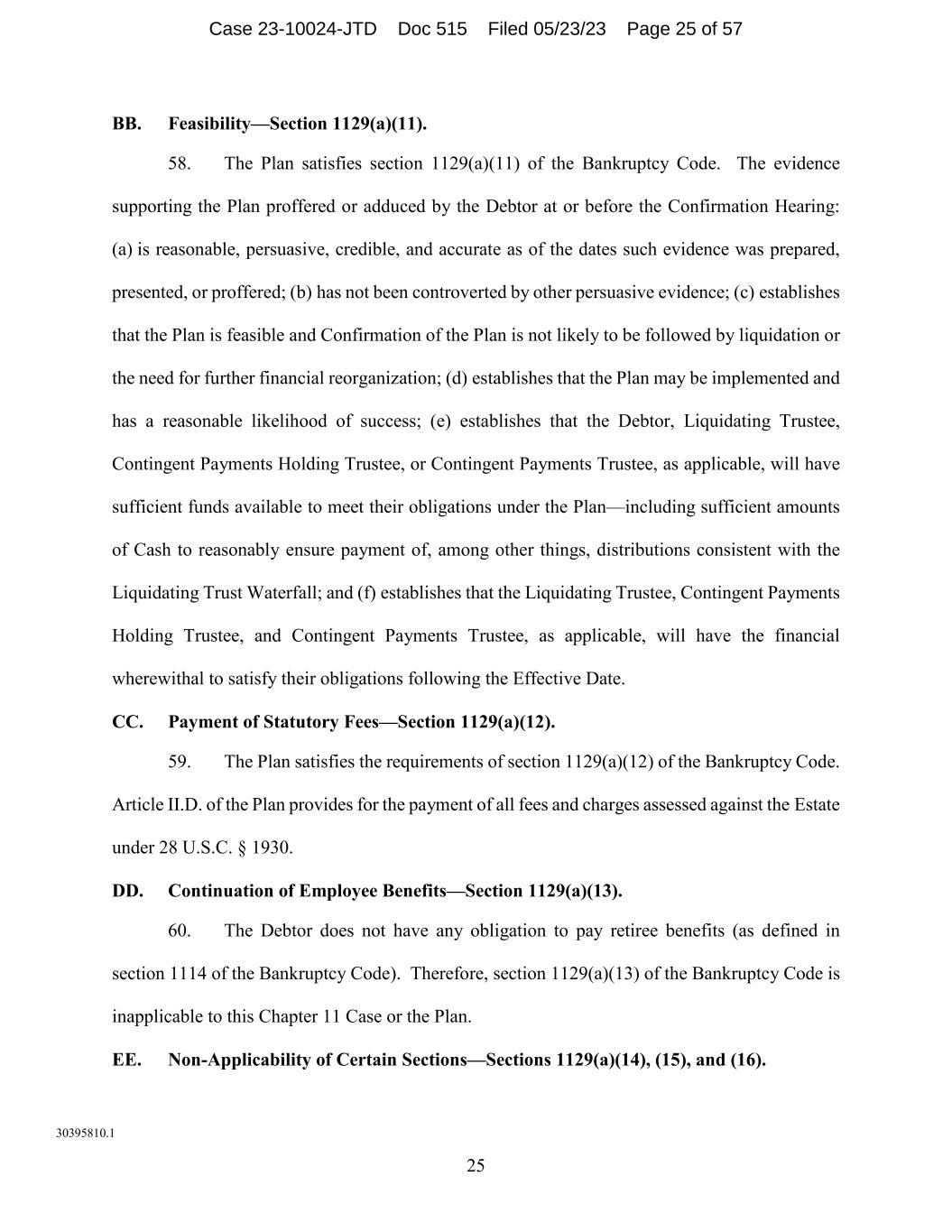 2530395810.1 BB。可行性——第1129(a)(11)节。58.该计划符合《破产法》第1129(a)(11)条的规定。债务人在确认听证会上或之前提出或援引的支持计划的证据:(a)在准备、提出或提供此类证据之日是合理的、有说服力的、可信的和准确的;(b)没有被其他有说服力的证据反驳;(c)证明计划是可行的,确认计划后不太可能出现清算或进一步财务重组的需要;(d)证明计划可以实施,并有合理的成功可能性;(e)证明债务人、清算受托人、或有付款持有受托人,或或有付款受托人(如适用)将有足够的资金来履行其在该计划下的义务——包括足够的现金,以合理地确保支付(其中包括)与清算信托瀑布一致的分配;(f)确定清算受托人、或有付款持有受托人和或有付款受托人(如适用)将有足够的资金在生效日期后履行其义务。CC. CC. CC. CC. CC. CC. CC. CC. CC. CC. CC. CC. CC. CC. CC. CC. CC. CC. CC. CC. CC. CC. CC. CC. CC. CC. CC. CC. CC. CC. CC. CC. CC. CC. CC. CC. CC. CC. CC. CC. CC. CC. CC. CC. CC. CC. CC. CC. CC. CC. CC. CC. CC. CC. CC. CC. CC. CC. CC. CC. CC. CC. CC. CC. CC. CC. CC. CC. CC. CC. CC. CC. CC. CC. CC. CC. CC. CC. CC. CC. CC. CC. CC. CC. CC. CC. CC. CC. CC. CC. CC. CC. CC. CC. CC法定费用的支付——第1129(a)(12)条。59.该计划符合《破产法》第1129(a)(12)条的规定。该计划的第二条规定支付根据《美国法典》第28章§ 1930对遗产征收的所有费用。DD. DD. DD. DD. DD. DD. DD. DD. DD. DD. DD. DD. DD. DD. DD. DD. DD. DD. DD. DD. DD. DD. DD. DD. DD. DD. DD. DD. DD. DD. DD. DD. DD. DD. DD. DD. DD. DD. DD. DD. DD. DD. DD. DD. DD. DD. DD. DD. DD. DD. DD. DD. DD. DD. DD. DD. DD. DD. DD. DD. DD. DD. DD。雇员福利的延续——第1129(a)(13)节。60.债务人没有任何支付退休人员福利的义务(如《破产法》第1114条所界定)。因此,《破产法》第1129(a)(13)条不适用于本第11章案件或本计划。EE。某些条文不适用─第1129(a)(14)、(15)及(16)条。判例23-10024-JTD Doc 515提交05/23/23第25页,共57页