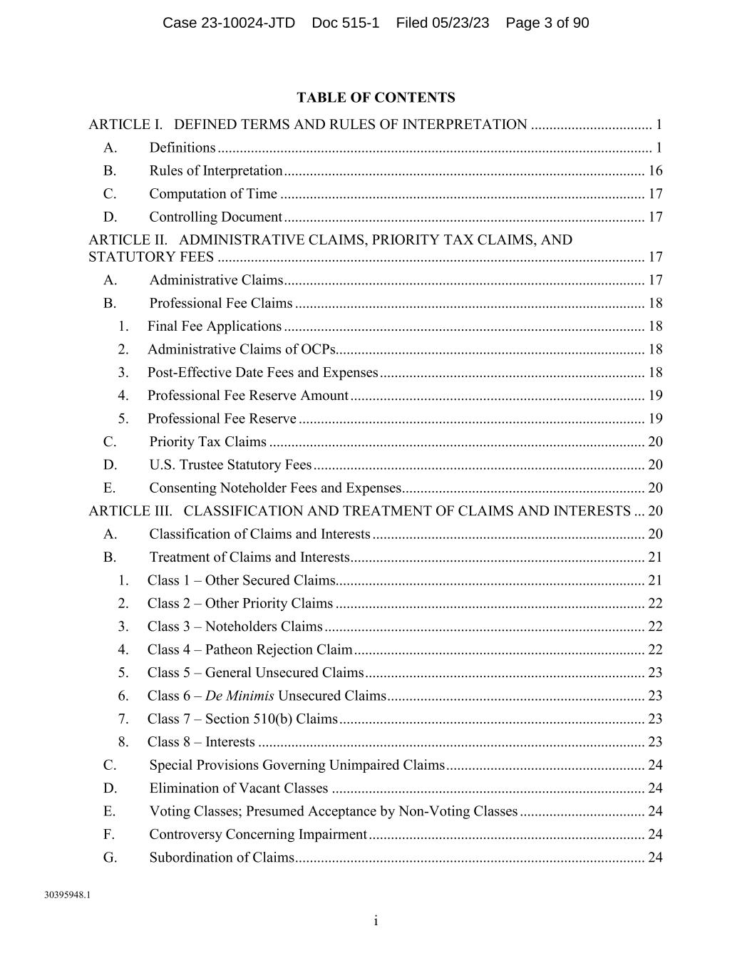 i 30395948.1目录第一条。定义的术语和解释规则................................................................................................1 B.解释规则......................................................................................................16 C.时间的计算.................................................................................17 D.控制文件..................................................................................................17第二条。行政索赔、优先权税收索赔和法定费用......................................................................................................17 A.行政索赔......................................................................................17 B.专业费用索赔............................................................................................18 1。最终费用申请..................................................................................................18 2。OCP的行政索赔....................................................................................18 3。生效日期后的费用和开支......................................................................................18 4。专业费用储备金额.................................................................................... 195。专业费用准备金......................................................................................................19 C.优先权税收要求......................................................................................20 D.美国受托人的法定费用......................................................................20 E.同意的票据持有人费用和开支......................................................................20第三条。ClassSIFICATION AND TREATMENT OF CLAIMS AND INTERESTS..。20 A.债权和权益的分类......................................................................................20 B.债权和权益的处理......................................................................................21 1。第1类–其他有担保债权....................................................................................2 12。第2类–其他优先债权....................................................................................2 23。第3类–票据持有人债权....................................................................................................2 24。第4类– Patheon驳回申索............................................................................................2 25。第5类–一般无担保债权....................................................................................2 36。第6类– De Minimis无担保债权...................................................................................23 7。第7类–第510(b)条的申索...................................................................................23 8。第8类–权益.....................................................................................................23 C.关于未受损害债权的特别规定.....................................................24 D.消除空缺类别.....................................................................24 E.投票类别;非投票类别的假定接受.....................................24 F.关于减值的争议.....................................................24 G.债权的从属地位.....................................................................24案例23-10024-JTD Doc 515-1提交05/23/23第3页,共90页