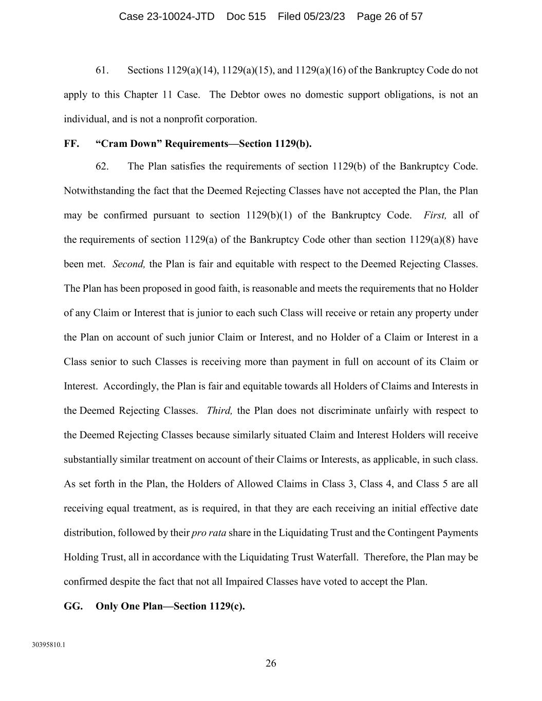 26 30395810.1 61.《破产法》第1129(a)(14)条、第1129(a)(15)条和第1129(a)(16)条不适用于本第11章案件。债务人不承担国内支助义务,不是个人,也不是非营利公司。FF。要求——第1129(b)节。62.该计划符合《破产法》第1129(b)条的规定。尽管被视为拒绝的类别并未接纳该计划,但该计划仍可根据《破产法》第1129(b)(1)条予以确认。首先,除第1129(a)(8)条外,《破产法》第1129(a)条的所有规定均已满足。第二,该计划对被认为拒绝接受的阶级是公平和公正的。该计划是善意提出的,是合理的,并符合以下规定:任何低于每一类的申索或利息的持有人,不会因该等较低的申索或利息而收取或保留该计划下的任何财产;而任何高于该等类别的申索或利息的持有人,亦不会因其申索或利息而收取超过全额的款项。因此,该计划对所有被视为拒绝类别的债权和权益持有人是公平和公正的。第三,该计划并没有对被视为拒绝的类别作出不公平的歧视,因为情况类似的债权和利息持有人将因其在这类类别中的债权或利息(如适用的话)而得到大致相同的待遇。正如该计划所述,第3类、第4类和第5类中的允许债权持有人都将按照要求得到同等待遇,因为他们都将获得初始生效日期的分配,然后是他们在清算信托和或有付款持有信托中的按比例份额,所有这些都符合清算信托瀑布。因此,尽管并非所有受损阶层都投票接受该计划,但该计划仍可能得到确认。GG。只有一个计划——第1129(c)节。判例23-10024-JTD Doc 515提交05/23/23第26页,共57页