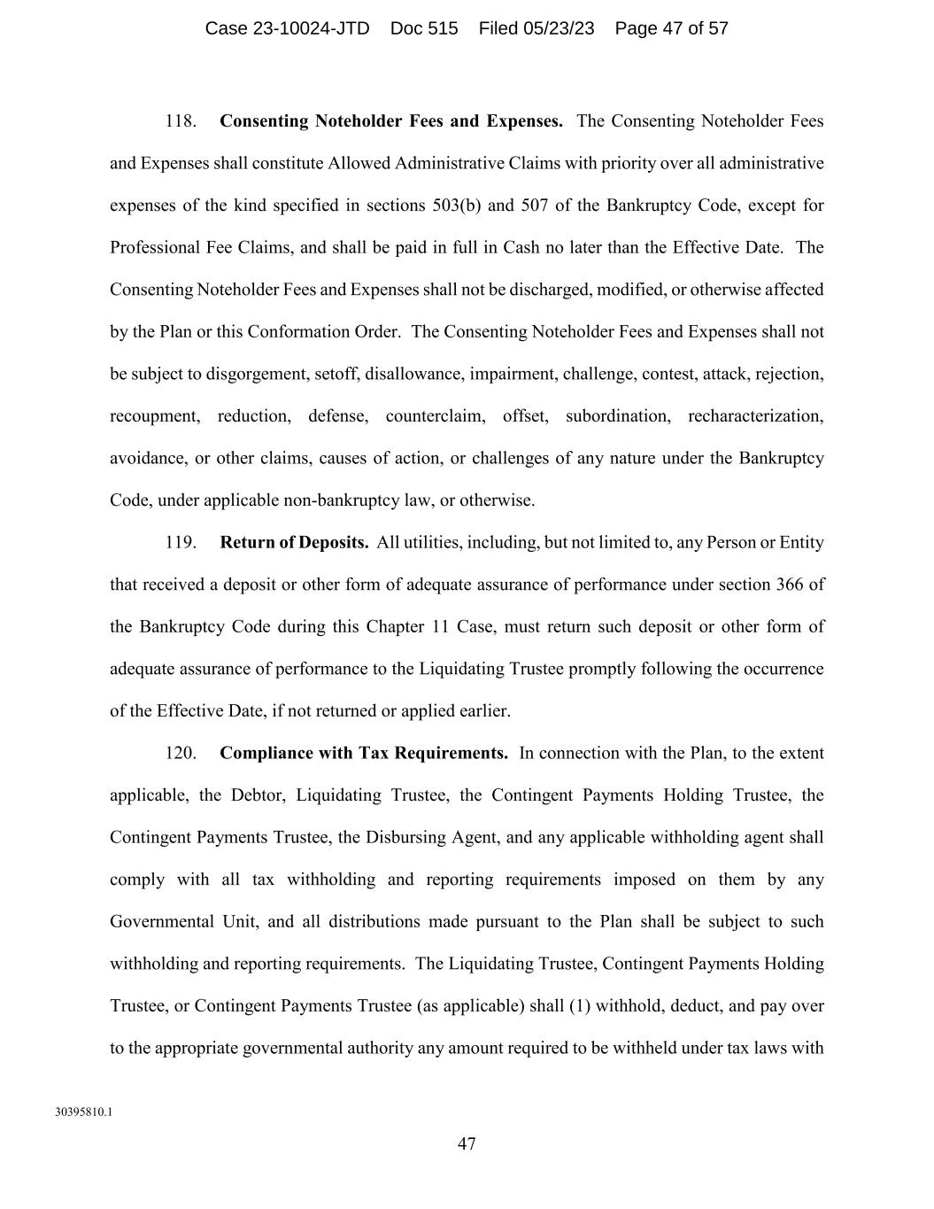 47 30395810.1 118.同意的记事人费用和开支。同意的记事人费用和开支应构成允许的行政索偿,优先于《破产法》第503(b)和507条规定的所有行政费用,但专业费用索偿除外,并应在生效日期之前以现金全额支付。同意记事人费用及开支不得因本计划或本确认令而解除、修改或以其他方式受影响。同意的票据持有人费用和开支不应受到追缴、抵销、不允许、减损、质疑、抗辩、攻击、拒绝、补偿、减少、抗辩、反索赔、抵销、从属地位、重新定性、撤销,或根据《破产法》、适用的非破产法或其他任何性质的索赔、诉讼因由或质疑。119.退还存款。所有公用事业单位,包括但不限于在本第11章案件期间根据《破产法》第366条收到保证金或其他形式的充分履约保证的任何个人或实体,必须在生效日期发生后立即将此种保证金或其他形式的充分履约保证退还清算受托人,如果没有在更早之前退还或适用。120.遵守税务规定。就本计划而言,在适用的范围内,债务人、清算受托人、或有付款持有受托人、或有付款受托人、付款代理人和任何适用的扣缴义务人应遵守任何政府单位对他们规定的所有扣缴税款和报告要求,根据本计划进行的所有分配均应遵守此类扣缴和报告要求。清算受托人、持有或有付款的受托人或或有付款的受托人(如适用)应(1)扣留、扣除并向有关政府当局支付根据税法要求扣留的任何金额,案例23-10024-JTD Doc 515提交05/23/23第47页,共57页