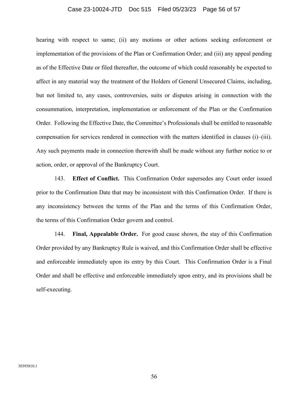 56303958 10.1就该计划或确认令进行聆讯;(ii)寻求强制执行或执行该计划或确认令条文的任何动议或其他行动;及(iii)截至生效日期尚待处理或其后提交的任何上诉,其结果可合理地预期会以任何重大方式影响一般无担保债权持有人的待遇,包括但不限于与完成、解释、执行或执行该计划或确认令有关的任何案件、争议、诉讼或争议。在生效日期之后,委员会的专业人员应有权就与第(i)-(iii)条所列事项有关的服务获得合理补偿。与此有关的任何该等付款,无须再向破产法院发出通知或采取行动、命令或批准。143.冲突的影响。本确认令取代在确认日期前发出的任何可能与本确认令不一致的法院命令。如本计划的条款与本确认令的条款有任何不一致之处,则由本确认令的条款管辖和控制。144.最终,可上诉的命令。如有正当因由,则任何破产规则所提供的本确认令的中止即予放弃,而本确认令一经本院进入,即属有效及可立即执行。本确认令为最终命令,在入境后立即生效并可执行,其规定可自动执行。判例23-10024-JTD Doc 515提交05/23/23第56页