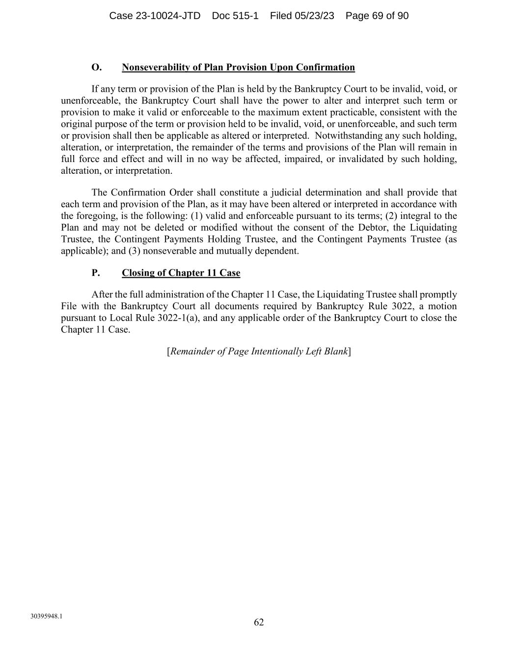 6230395948.1 O.确认后计划条款的不可分割性如果破产法院认为计划的任何条款或规定无效、无效或不可执行,破产法院有权修改和解释该条款或规定,使其在切实可行的最大限度内有效或可执行,与被认为无效、无效或不可执行的条款或规定的原始目的一致,然后该条款或规定应作为修改或解释而适用。尽管有任何此种保留、更改或解释,本计划的其余条款和规定仍将完全有效,并且不会因此种保留、更改或解释而受到影响、损害或失效。确认令应构成一项司法裁定,并应规定本计划的每项条款和规定(可能已根据上述规定加以修改或解释)如下:(1)根据其条款有效和可执行;(2)本计划不可分割,未经债务人、清算受托人、或有付款受托人和或有付款受托人(如适用)同意不得删除或修改;(3)不可分割和相互依存。第11章案件的结案在第11章案件的全部审理结束后,清算受托人应迅速向破产法院提交破产规则第3022条所要求的所有文件、根据当地规则第3022-1(a)条提出的动议,以及破产法院关于结束第11章案件的任何适用命令。[故意留空的页数余留]判例23-10024-JTD Doc 515-1归档05/23/23第69页,共90页