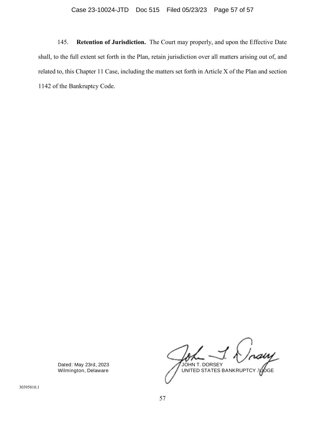 57 30395810.1 145.保留管辖权。法院可适当地并于生效日期起,在本计划所列的充分范围内,保留对因本第11章案件而产生和与之有关的所有事项的管辖权,包括本计划第十条和《破产法》第1142条所列的事项。JOHN T. DORSEY UNITED STATES BANKRUPTCY JUDGE Dated:May 23,2023 Wilmington,Delaware Case 23-10024-JTD Doc 515 Filed 05/23/23 Page 57 of 57