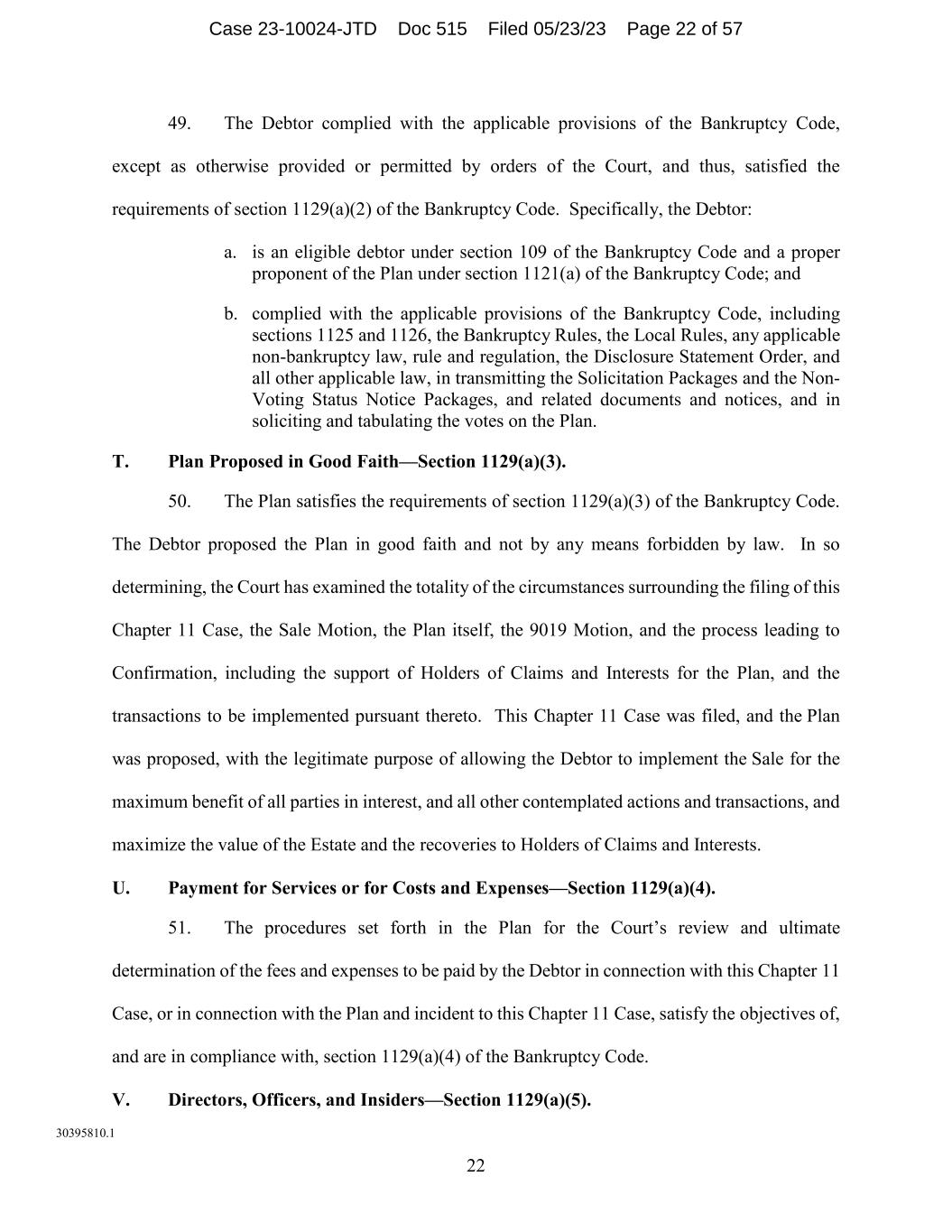 22 30395810.1 49.债务人遵守了《破产法》的适用条款,但法院命令另有规定或准许的除外,因此符合《破产法》第1129(a)(2)条的要求。具体而言,债务人:a.是《破产法》第109条规定的合格债务人,也是《破产法》第1121(a)条规定的计划的适当提出者;b.遵守《破产法》的适用条款,包括第1125和1126条、《破产规则》、《地方规则》、任何适用的非破产法、规则和条例、《披露声明令》和所有其他适用的法律,传送招标包和无表决权状态通知包以及相关文件和通知,并征集和制表对计划的投票。善意提议的计划——第1129(a)(3)条。50.该计划符合《破产法》第1129(a)(3)条的规定。债务人本着诚意而不是以任何法律禁止的方式提出该计划。在作出上述决定时,法院审查了围绕提交第11章案件、出售动议、计划本身、9019动议以及导致确认的程序的全部情况,包括索赔和权益持有人对计划的支持,以及根据计划执行的交易。这一第11章案件已提交,并提出了该计划,其合法目的是允许债务人为利益所有各方的最大利益实施出售,以及所有其他预期的行动和交易,并使遗产的价值和对债权和权益持有人的追偿最大化。U.服务或费用和开支的支付——第1129(a)(4)节。51.法院审查和最终确定债务人就第11章案件或与第11章案件的计划和事件有关的费用和开支的计划中规定的程序符合《破产法》第1129(a)(4)条的目标,并符合这些程序。五、董事、高级职员和内部人士——第1129(a)(5)节。判例23-10024-JTD Doc 515提交05/23/23第22页,共57页
