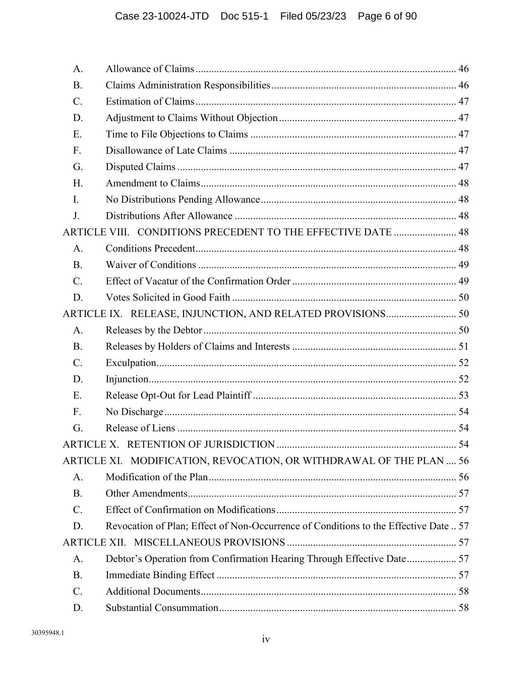 iv 30395948.1 A.索赔备抵.....................................................................................................46 B.索赔管理责任.....................................................................................46 C.索赔的估计.................................................................................47 D.对无异议索赔的调整.................................................................................47 E.对索赔提出异议的时间.................................................................................47 F.驳回逾期索赔.................................................................................................47 H.对索赔的修正.................................................................................................48 I.在备抵之前不分配.................................................................48 J.备抵后的分配.....................................................................................48第八条。生效日期之前的条件.................................48 A.先决条件.................................................................................48 B.条件的放弃.................................................................................................49 C.确认令的效力.................................................................49 D.善意征集投票....................................................................................50第九条。释放、禁制和相关规定.................................50 A.债务人的释放.................................................................................50 B.债权和权益持有人的释放.................................................................................51 C.免责.................................................................................................52 D.禁制.................................................................................................................................52 E.主要原告的选择退出的释放.................................................................................................53 F.不释放.................................................................................54 G.释放留置权.................................................................................................54第十条保留管辖权.................................................................................54 XI。修改、撤销或撤回计划...。56 A.计划的修改...............................................................................................................56 B.其他修改.......................................................................................57 C.确认对修改的影响.....................................................................57 D.计划的撤销;条件不发生对生效日期的影响.。57第十二条。杂项条文.................................................................57 A.债务人自确认聆讯起至生效日期的运作.................................57 B.即时约束效力.................................................................................57 C.附加文件......................................................................................58 D.实质性完成...................................................................58判例23-10024-JTD Doc 515-1提交05/23/23第6页,共90页